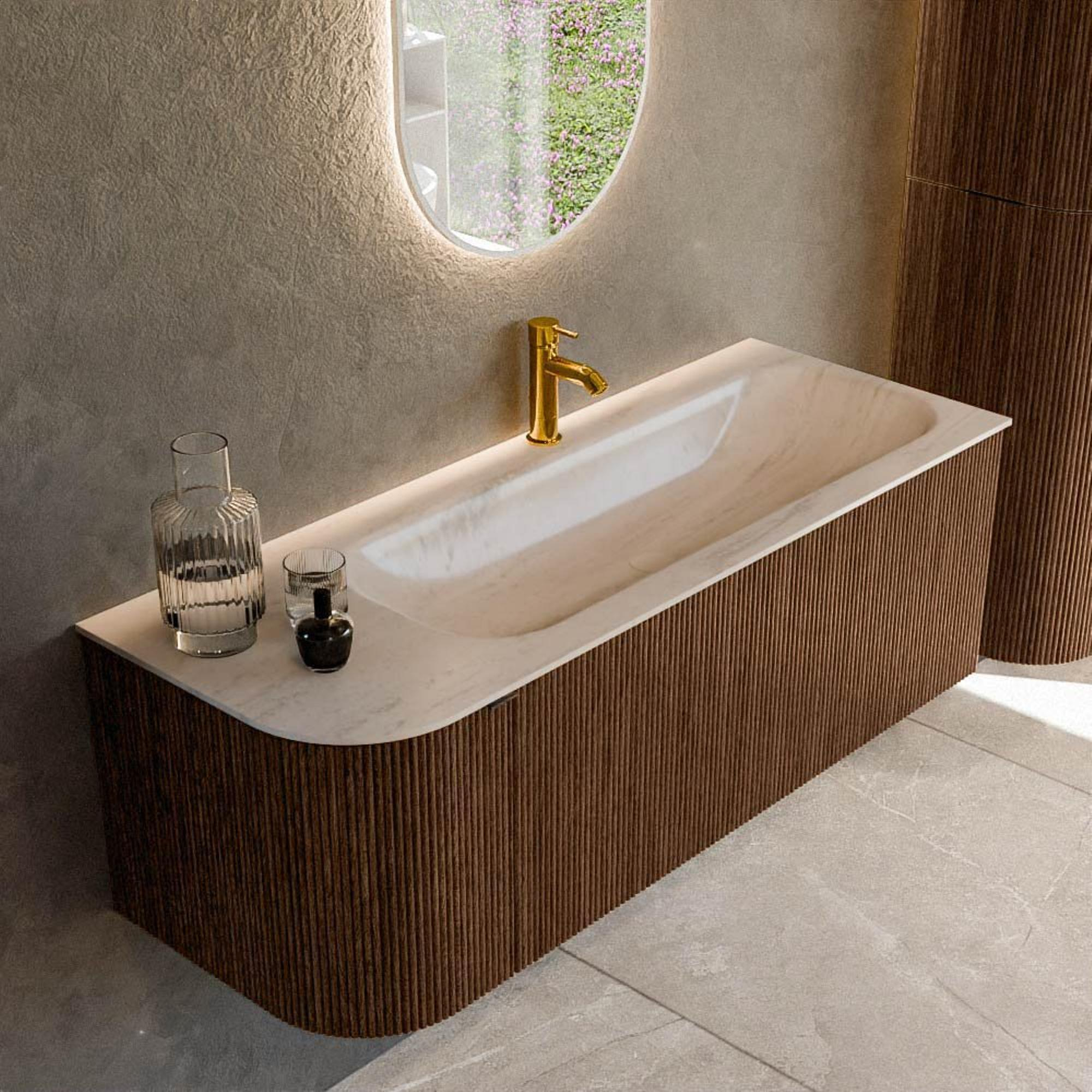MONDIAZ KURVE-DLUX 125cm badmeubel ronding Links kleur Walnut met 1 lade en 1 deur. Wastafel BIG MEDIUM Rechts 1 kraangat Meli.