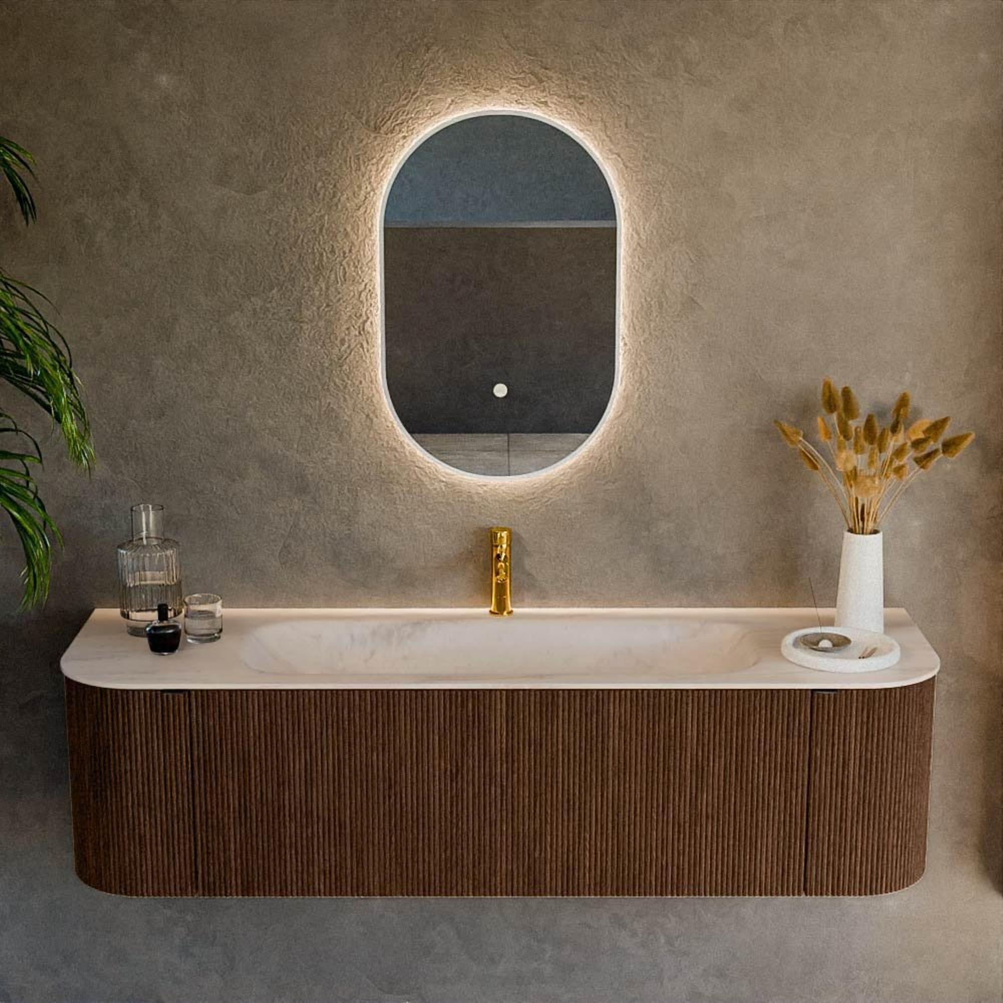 Les formes arrondies à gauche et à droite donnent à ce meuble un look distinctif qui attire immédiatement l'attention dès que vous entrez dans la salle de bains. La couleur walnut avec structure bois ajoute chaleur et caractère, sans être criarde. Il se combine ainsi facilement avec des carreaux blancs, beiges ou au contraire foncés. La structure nervurée verticale visible sur les façades apporte une profondeur et un luxe supplémentaires, comme si vous faisiez entrer chez vous un meuble sur mesure issu d'un studio de design. Comme le meuble est fixé en suspension au mur, le sol reste libre : cela donne une impression d'espace et un côté contemporain. Cela en fait un excellent choix si vous souhaitez créer une salle de bains moderne avec une ambiance d'hôtel, sans faire de concessions sur la fonctionnalité.