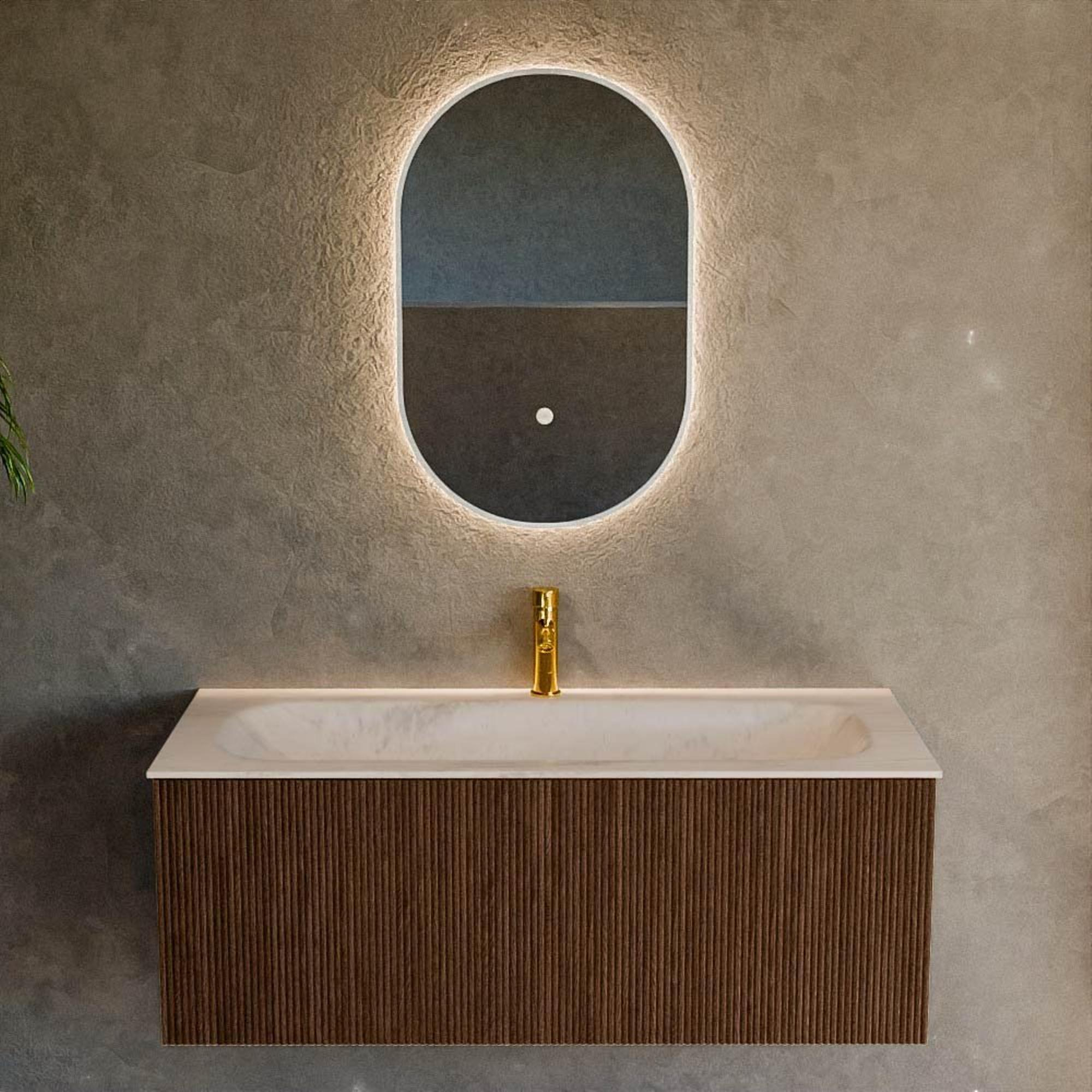 La couleur walnut combinée à la façade verticale à nervures donne immédiatement à votre salle de bains une apparence luxueuse et faite sur mesure. La structure subtile du bois et l’effet de profondeur des nervures créent un jeu de lumière ludique, ce qui fait que le meuble paraît légèrement différent sous chaque angle. Il devient ainsi un véritable accroche-regard sans être criard. L’aspect bois se combine en outre facilement avec des robinets et accessoires noirs, couleur chrome ou en métal brossé, mais aussi avec des carreaux clairs ou foncés. Vous pouvez ainsi adapter le style de votre salle de bains au fil des années, tandis que ce meuble suit sans effort l’évolution de vos goûts.