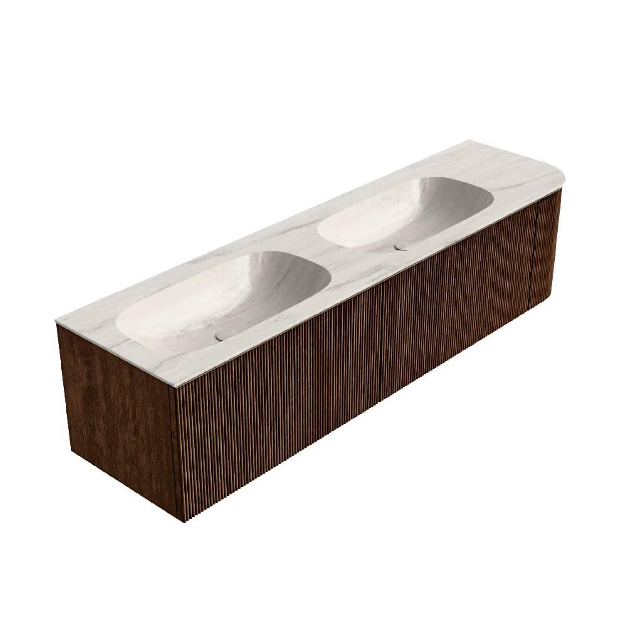 MONDIAZ KURVE-DLUX 175cm meuble de salle de bains arrondi Droite couleur Walnut avec 2 tiroirs et 1 porte. Lavabo STOR SMALL Double / Gauche 2 trous de robinet Meli.