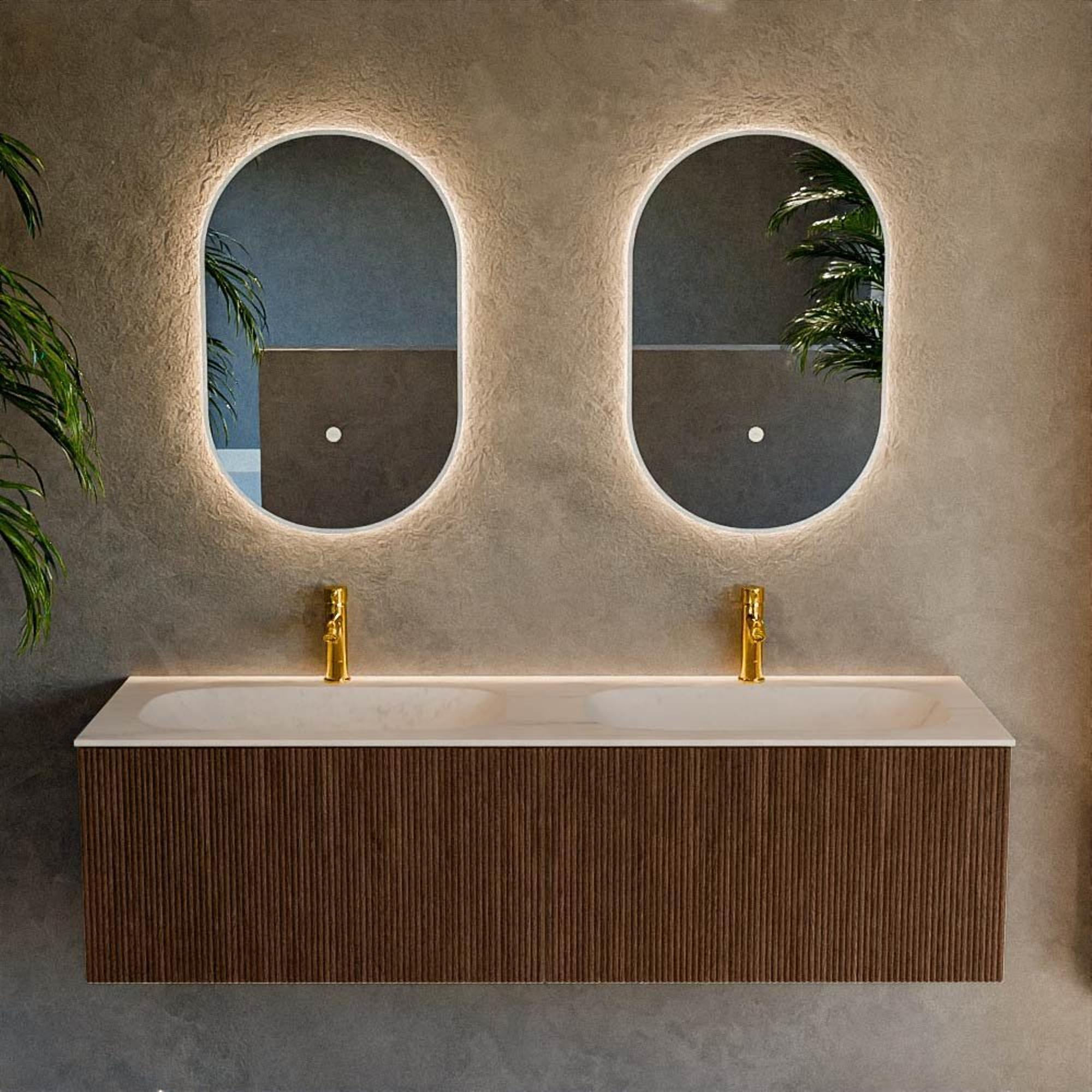 La combinaison de la couleur Walnut avec la façade à nervures verticales donne immédiatement à votre salle de bains une apparence exclusive, presque comme un véritable meuble. Au lieu d’une façade droite standard, les nervures douces et semi-circulaires créent de la profondeur et un jeu d’ombres, donnant au meuble un aspect vivant sans devenir chargé. Cela en fait un élément idéal comme accroche-regard sous un grand miroir ou un miroir armoire. La teinte boisée s’accorde à la fois avec des carreaux clairs et foncés, vous offrant ainsi beaucoup de liberté pour le reste de la conception de votre salle de bains. Comme le meuble est monté de façon suspendue au mur, le sol reste visible et l’espace paraît optiquement plus grand et plus aéré, ce qui est un grand avantage surtout dans les salles de bains plus petites ou en longueur.