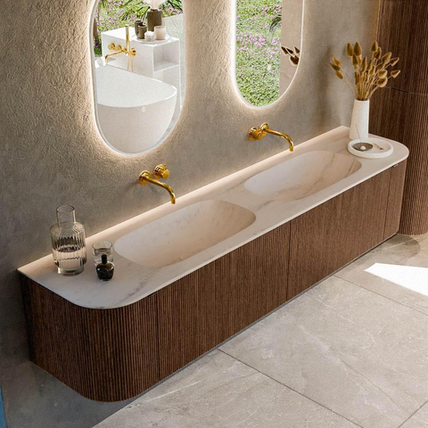 La combinaison des formes arrondies des façades et de la couleur noyer confère immédiatement à votre salle de bains une atmosphère luxueuse et détendue. La ligne horizontale du meuble de 200 cm de large met l'accent sur l'espace, tandis que les angles arrondis rendent l'ensemble accueillant et moderne. La couleur bois s'accorde parfaitement avec différents styles : du style hôtel chic avec des carreaux foncés et des accents noir mat à une salle de bains scandinave ou type spa avec des teintes claires. Comme le meuble est monté en suspension, il paraît moins massif malgré ses dimensions généreuses et le sol semble se prolonger visuellement. Vous profitez ainsi d'un grand espace de rangement, sans que votre salle de bains paraisse chargée ou encombrée.