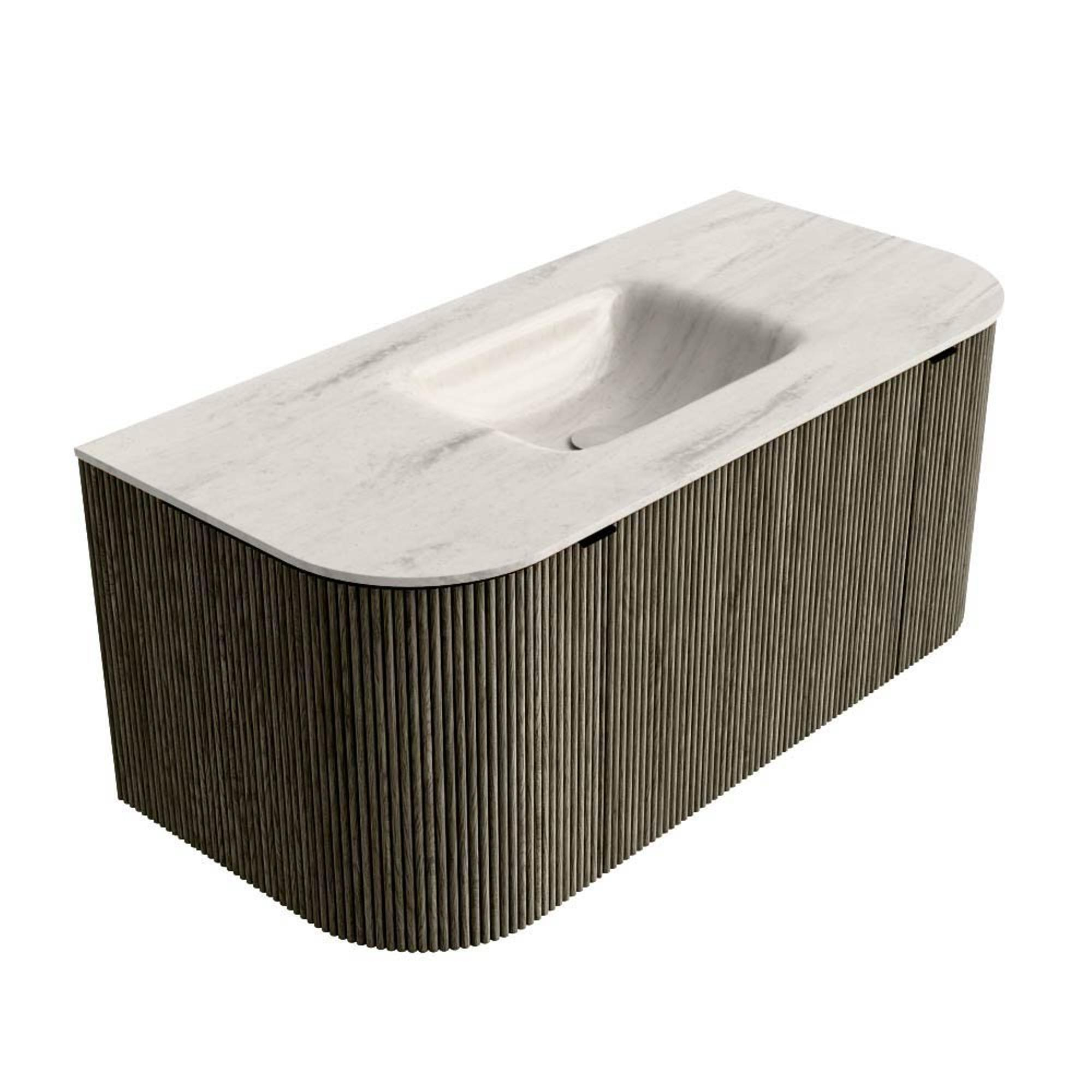 MONDIAZ KURVE-DLUX Meuble de salle de bains 100cm arrondi gauche + droite couleur Shadow avec 1 tiroir et 2 portes. Lavabo GRUNNE central sans trou de robinet Meli.
