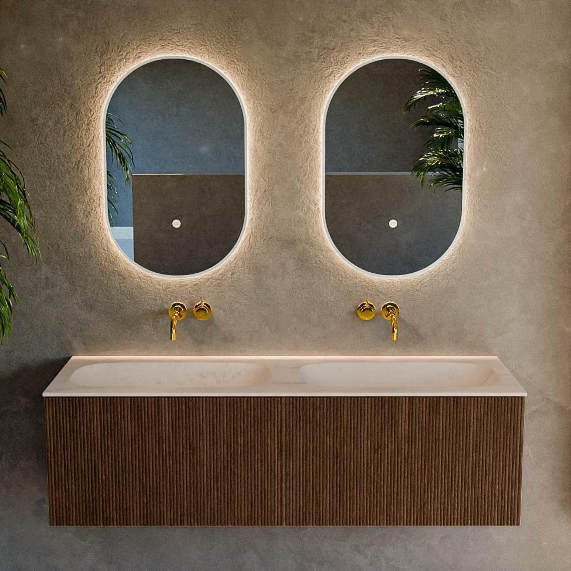 La couleur noyer et la façade nervurée verticale confèrent à ce meuble un look design affirmé qui fait immédiatement passer votre salle de bains à un niveau supérieur. Le décor bois apporte chaleur et ambiance, tandis que les lignes épurées et la finition sans poignées créent une base moderne et apaisante. Grâce à la teinte bois, ce meuble s’accorde parfaitement avec des carreaux en pierre naturelle et un effet béton, mais aussi avec des carreaux en céramique clairs. Si vous optez pour des robinets et accessoires noirs ou en métal brossé, vous obtenez un style contemporain et affirmé