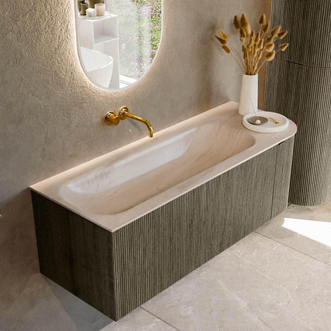 - Meuble de salle de bains généreux de 125 cm de large avec forme asymétrique et courbure à droite pour une apparence douce et moderne.