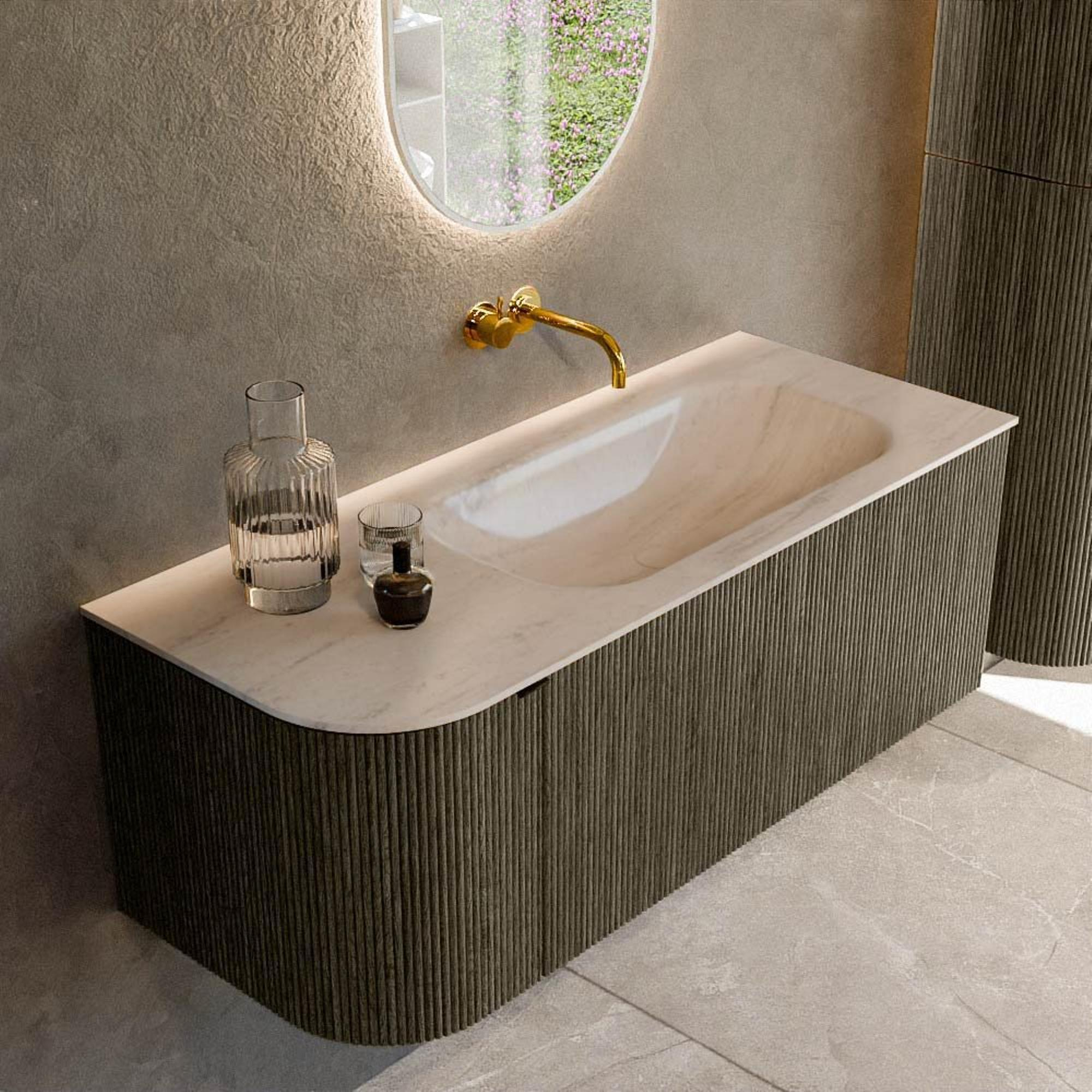 MONDIAZ KURVE-DLUX 115cm badmeubel ronding Links kleur Shadow met 1 lade en 1 deur. Wastafel BIG SMALL Rechts zonder kraangat Meli.