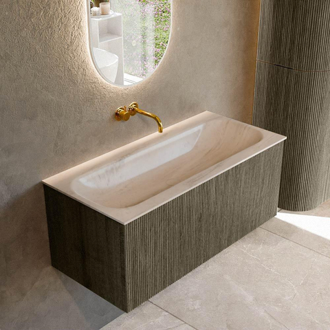 Avec ce meuble de salle de bains élégant, vous apportez chez vous un élément moderne et fonctionnel qui attire le regard et qui s'intègre parfaitement dans une salle de bains contemporaine. Grâce à son format compact de 100 cm de large, c'est un choix idéal aussi bien pour les salles de bains de taille moyenne que pour les pièces plus spacieuses, où vous souhaitez un style épuré et calme sans sacrifier l'espace de rangement. La couleur grise subtile et la façade nervurée raffinée permettent de le combiner facilement avec différents types de carrelage, de robinets et d'accessoires, du noir mat au métal brossé. Le tiroir sans poignée, push-to-open, assure un look minimaliste et une grande facilité d'utilisation dans le rythme quotidien, que vous viviez dans un foyer animé ou que vous souhaitiez créer une ambiance chic façon hôtel pour vous-même. En combinaison avec le lavabo en solid surface sans trou de robinet, vous êtes en outre totalement libre de choisir un mitigeur à poser et un robinet mural assortis, de sorte que l'ensemble s'accorde parfaitement à votre style personnel.