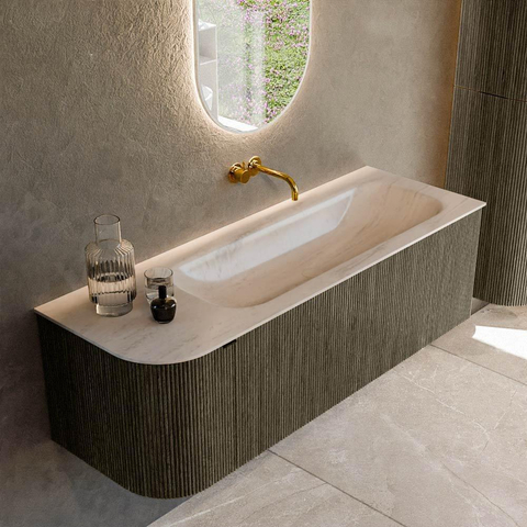 Avec ce meuble de salle de bains spacieux, vous créez en une seule fois une base luxueuse et apaisante pour votre salle de bains. La largeur généreuse de 135 cm offre amplement d'espace pour effectuer confortablement vos routines quotidiennes, tandis que l'élégant arrondi à gauche fait doucement suivre la ligne de passage dans la pièce. Cela rend ce meuble idéal pour les salles de bains de taille moyenne à spacieuse, surtout si vous aimez combiner style et fonctionnalité. Le lavabo intégré avec cuve à droite est particulièrement pratique si vous souhaitez un point d'eau fixe, tout en trouvant important de disposer de suffisamment d'espace de dépose à côté de la cuve. Grâce à l'agencement intelligent avec un tiroir et une porte, vous disposez en outre de suffisamment d'espace de rangement pour garder votre salle de bains ordonnée et sereine, ce qui contribue à un aspect soigné et à une sensation de détente.