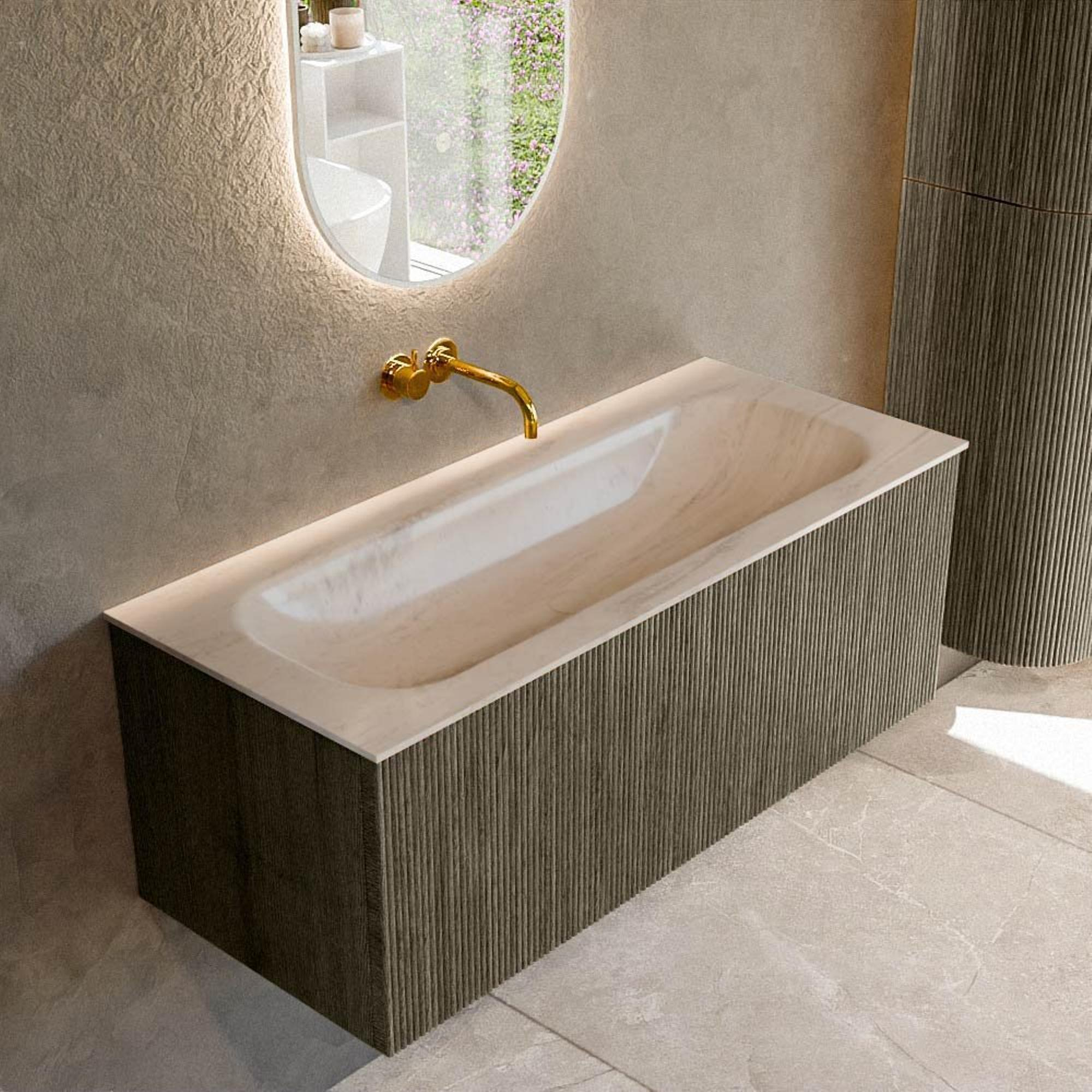 La couleur Shadow combinée à la façade à rainures verticales fait de ce meuble un véritable accroche-regard. La teinte chaude et foncée apporte immédiatement profondeur et ambiance à votre salle de bains, tandis que la structure rainurée casse subtilement la lumière et donne aux façades une allure luxueuse et sur mesure. Comme le lavabo de couleur Meli se prolonge discrètement au-dessus, un beau contraste se crée entre le plan et la façade sans que l’ensemble paraisse chargé. Cela rend le meuble particulièrement adapté si vous souhaitez créer une salle de bains moderne et orientée design, dans laquelle le meuble de salle de bains joue un rôle central. Placez-le par exemple contre un mur carrelé clair et sobre pour un contraste supplémentaire, ou associez-le au contraire à des carreaux foncés pour une allure hôtel chic.