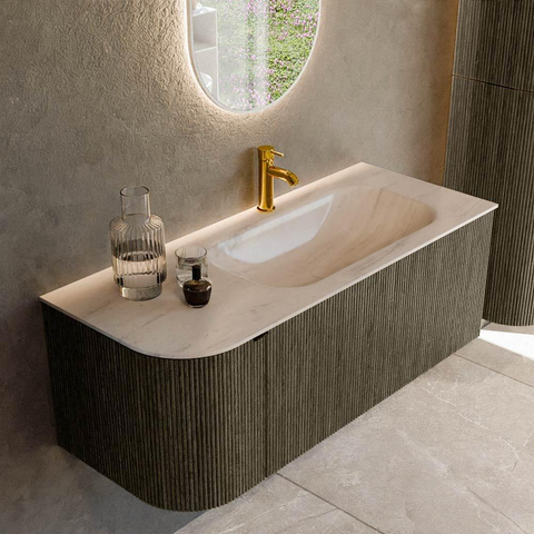 - Meuble de salle de bains élégant de 115 cm de large avec forme arrondie sur le côté gauche, idéal pour les salles de bains de taille moyenne à spacieuse.