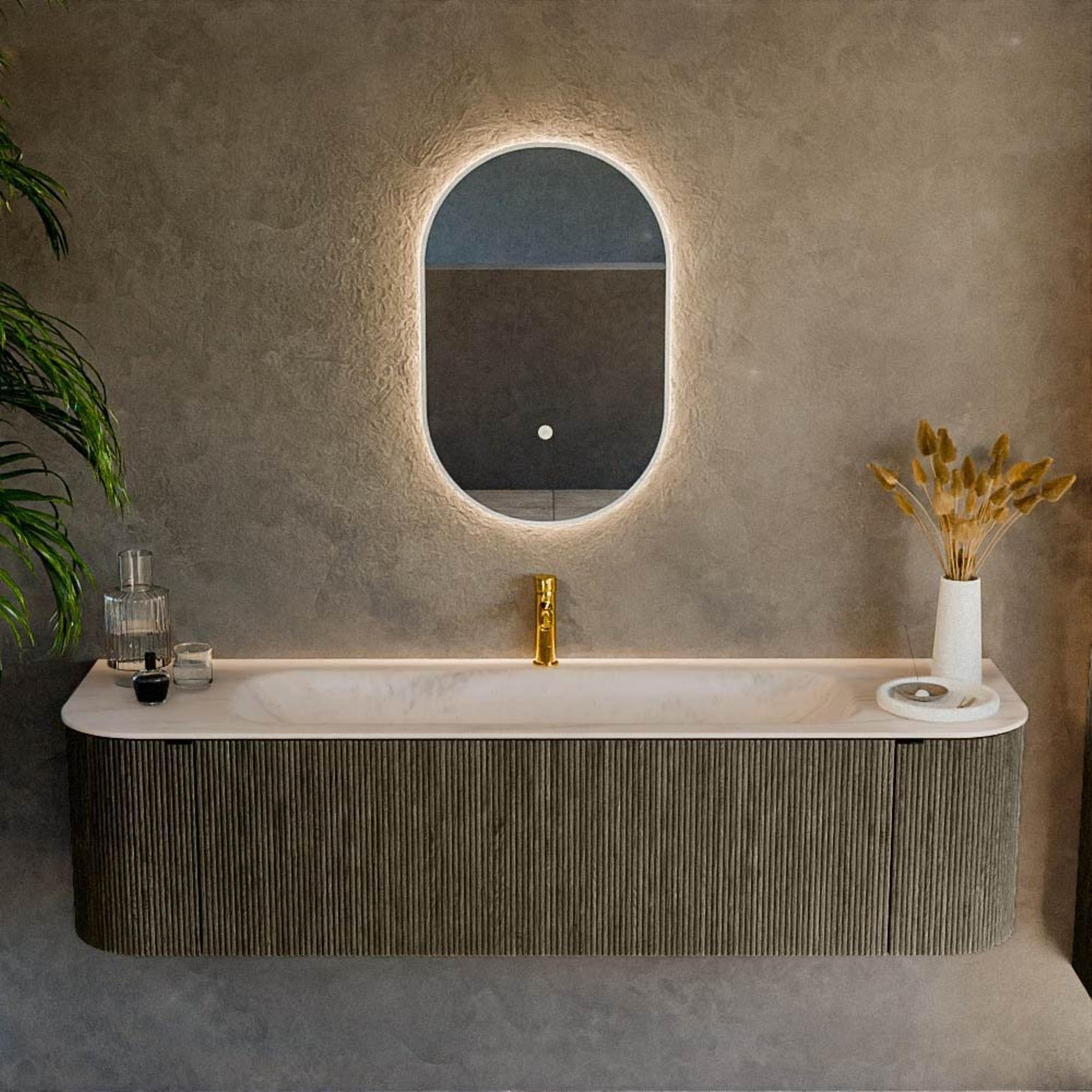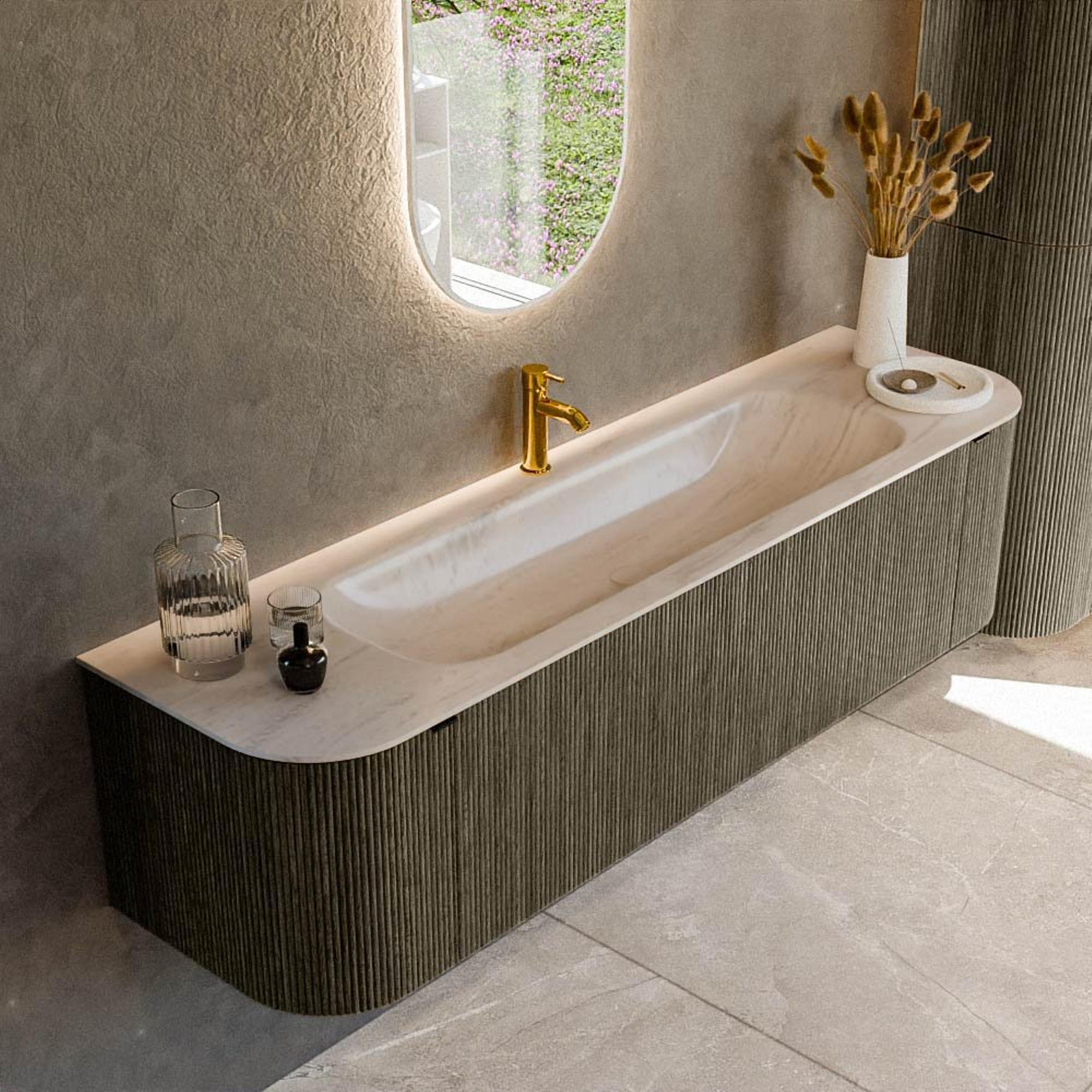 Les angles arrondis à gauche et à droite donnent à ce meuble une silhouette unique et accueillante qui attire immédiatement le regard sans être criarde. Combiné à la façade à rainures avec structure verticale, il crée un jeu de lumière et d’ombre ludique qui donne immédiatement plus de profondeur et de caractère à votre salle de bains. La couleur Shadow est une teinte de gris moderne qui paraît chaleureuse et s’accorde ainsi parfaitement avec des robinets noirs, mais aussi avec du chrome ou du métal brossé. Grâce à la largeur généreuse de 170 cm, l’ensemble ressemble à un meuble sur mesure de luxe issu d’un showroom de design, alors qu’en pratique il est simplement bien pensé et agréable à utiliser au quotidien. Vous créez ainsi facilement un ensemble haut de gamme et harmonieux dans lequel la vasque, le plan et le meuble ne forment qu’un tout apaisant.