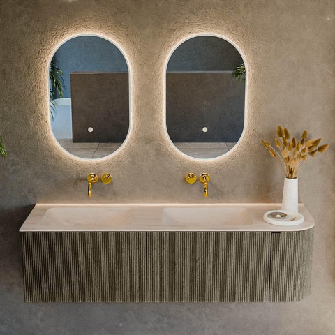 Avec une largeur de 155 cm, deux tiroirs et une porte, vous disposez de plus qu’assez d’espace pour garder votre salle de bains bien organisée. La double vasque positionnée à gauche offre deux zones d’utilisation confortables, idéale si vous utilisez souvent la salle de bains en même temps que votre partenaire ou vos enfants. Comme la vasque est réalisée sans trous de robinet, vous pouvez choisir vous-même de superbes robinetteries à poser ou opter pour des robinets muraux pour un effet épuré digne d’un hôtel. La forme arrondie sur le côté droit offre plus d’espace de circulation, ce qui est particulièrement agréable dans les salles de bains plus étroites. Vous combinez ainsi praticité et agencement ergonomique bien pensé.