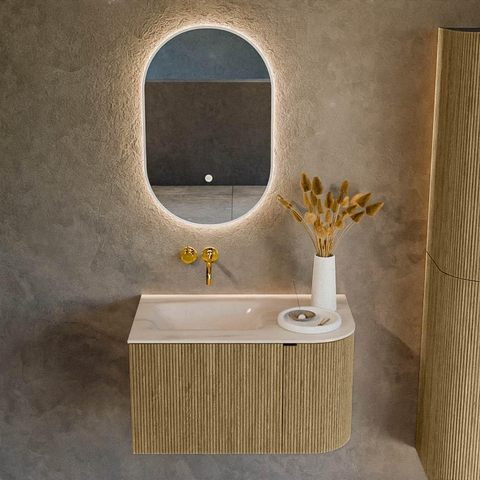 La forme arrondie sur le côté droit n’est pas seulement un détail esthétique, mais surtout une solution astucieuse lorsque votre meuble se trouve près d’un passage ou d’une douche. Les angles dans lesquels vous vous cognez appartiennent au passé, tout en profitant d’une largeur généreuse de 75 cm et d’une profondeur confortable de 46 cm. La forme asymétrique apporte en outre une touche ludique et moderne sans que l’ensemble paraisse chargé. En combinaison avec le montage mural, le meuble semble flotter, ce qui agrandit visuellement le sol et donne une impression d’espace à votre salle de bains. Vous tirez ainsi une fonctionnalité maximale d’un format relativement compact, avec un design qui fait réellement la différence.