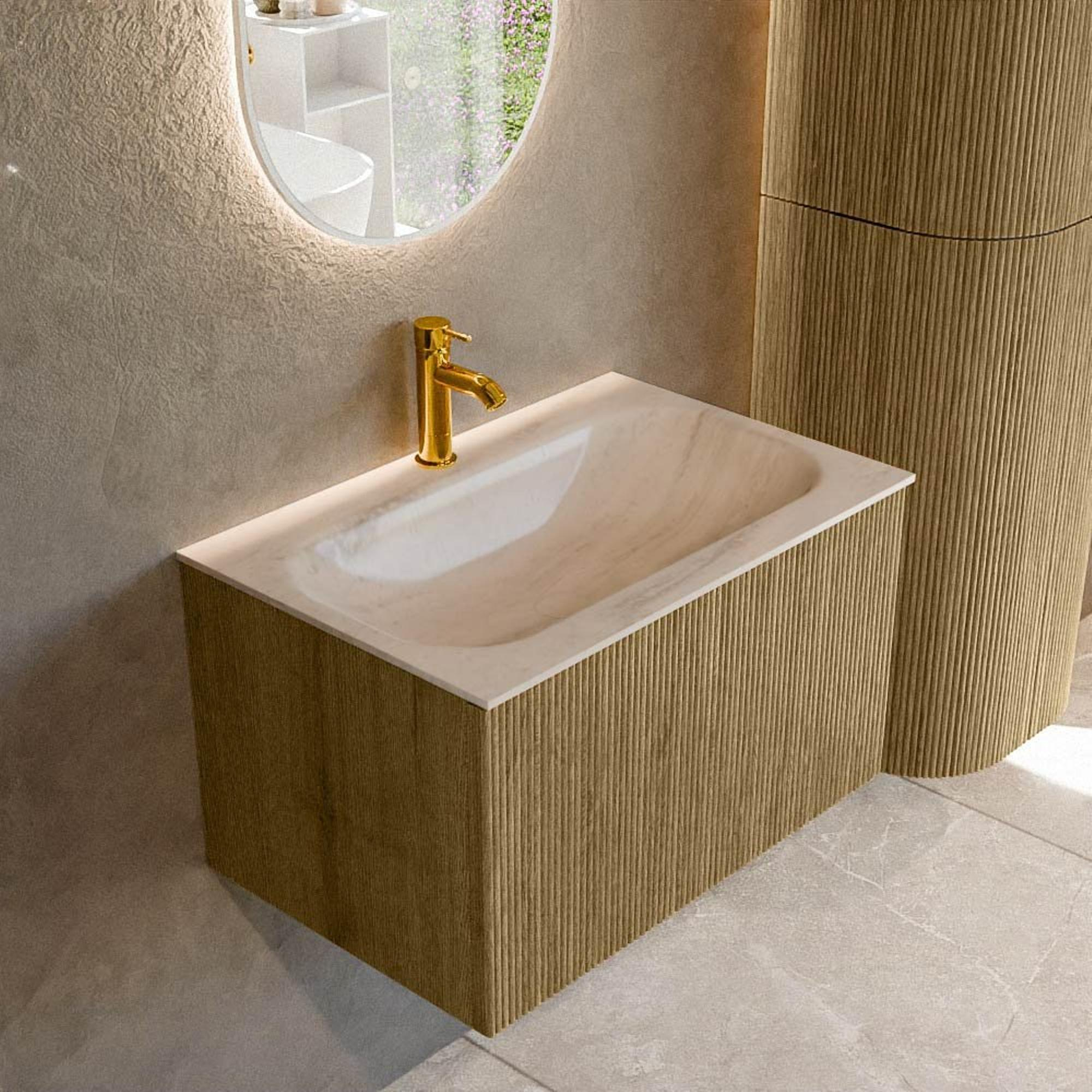 Avec ce meuble de salle de bains compact, vous créez en une seule fois une base calme et luxueuse dans votre salle de bains ou vos toilettes. Grâce à la largeur de 70 cm, c'est un choix idéal pour les salles de bains petites à moyennes, où vous souhaitez à la fois un espace de rangement et un lavabo complet, sans pour autant un meuble massif qui domine la pièce. La teinte bois douce s'accorde parfaitement aux intérieurs naturels, modernes et scandinaves, tandis que les lignes épurées veillent à ce que tout paraisse calme et ordonné. La fixation murale libère le sol, ce qui est pratique pour le nettoyage et renforce en plus l'effet d'espace. Vous recherchez un ensemble élégant et coordonné avec un lavabo assorti, et vous aimez le luxe subtil avec des détails astucieux tels que softclose et push-to-open ? Alors ce meuble s'intègre parfaitement dans la salle de bains de vos rêves.