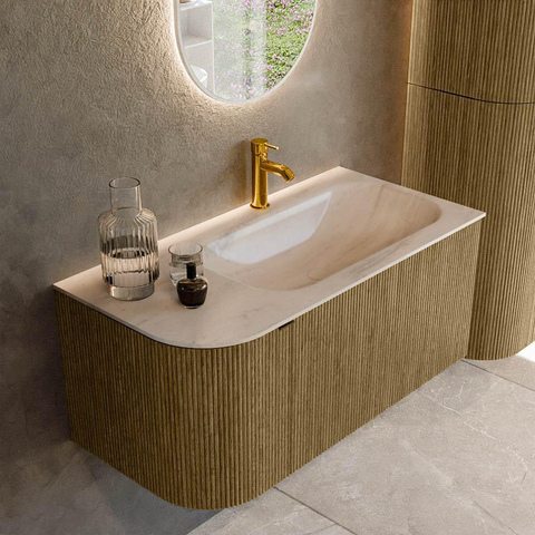 Avec ce meuble de salle de bains compact mais très bien pensé, vous créez une atmosphère calme et luxueuse dans la salle de bains, sans sacrifier l’espace de rangement ni le confort d’utilisation. Grâce à sa largeur de 95 cm et à sa forme arrondie sur le côté gauche, il s’intègre parfaitement dans une salle de bains de taille moyenne, une salle de bains familiale moderne ou une élégante suite parentale. Le lavabo asymétrique avec vasque à droite vous offre un large espace de lavage, tandis qu’à gauche vous conservez suffisamment de surface pour vos objets du quotidien. La teinte bois chaleureuse Dusk et la façade nervurée subtile créent une ambiance naturelle et apaisante qui se marie harmonieusement aussi bien avec des carreaux clairs que foncés. Vous optez ainsi pour un meuble qui ne se contente pas d’être esthétique le jour de la pose, mais qui, même après des années d’utilisation intensive, reste confortable, pratique et contemporain.