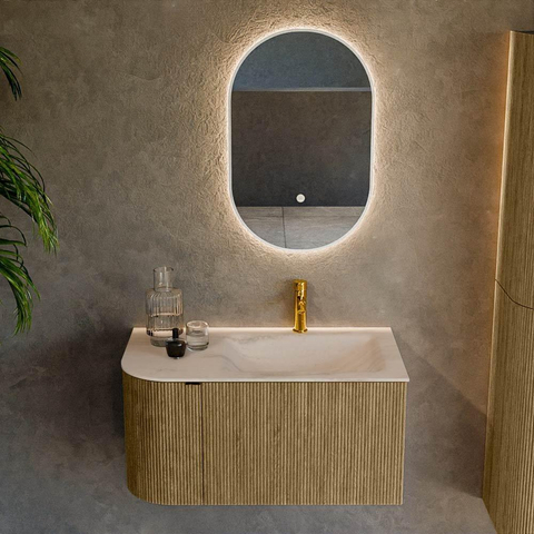 La couleur Dusk et la façade cannelée verticale confèrent à ce meuble une apparence luxueuse, proche du mobilier, qui apporte immédiatement plus d’ambiance et de caractère à votre salle de bains. La forme arrondie sur le côté gauche adoucit les lignes de l’espace et est particulièrement agréable lorsque le meuble se trouve près d’un passage ou d’une douche, car vous heurtez moins facilement un angle vif. La teinte bois se marie très bien avec des robinets et accessoires noirs, chromés ou en métal brossé, mais aussi avec de douces teintes terreuses pour le carrelage ou l’enduit. Vous pouvez ainsi créer facilement un ensemble harmonieux, que vous optiez pour une salle de bains façon hôtel moderne, un look scandinave lumineux ou un style bien-être chaleureux. La finition sans poignées souligne le design épuré et garantit que le meuble garde une allure intemporelle et apaisante.
