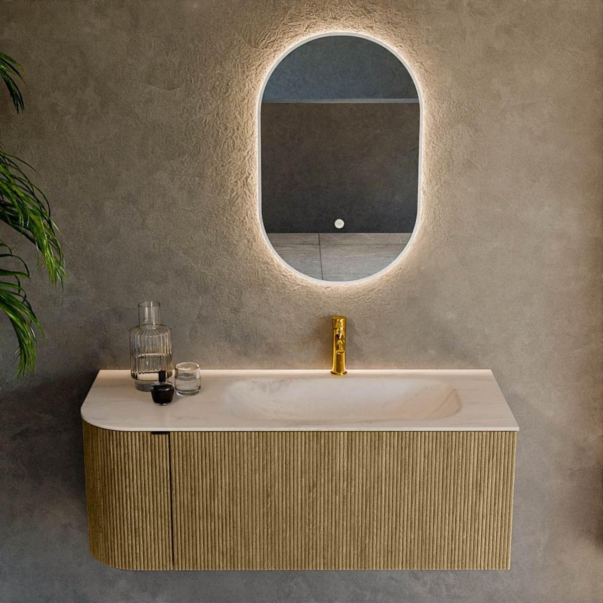 La couleur Dusk et les façades verticales rainurées donnent à ce meuble une allure exclusive, presque digne d’un hôtel. La subtile teinte boisée se marie à merveille avec des carreaux effet béton clair comme avec des effets pierre naturelle foncés, ce qui en fait un choix sûr et intemporel. La structure verticale de la façade crée une profondeur supplémentaire et un jeu de lumière ludique, faisant immédiatement de ce meuble le point de mire de la pièce. Grâce à la forme arrondie sur le côté gauche, le meuble bas paraît doux et accueillant, ce qui rend l’ensemble moins anguleux, surtout dans les petites salles de bains. Cela rend le meuble particulièrement adapté si vous souhaitez une salle de bains moderne avec une atmosphère chaleureuse et conviviale plutôt qu’un aspect stérile.