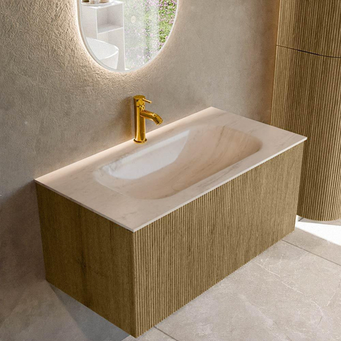 La teinte chaude Dusk associée à la façade à rainures verticales donne immédiatement du caractère à ce meuble. La façade a un aspect luxueux et original, sans être tape-à-l'œil, de sorte que votre salle de bains bénéficie d'une apparence calme et haut de gamme. La nuance douce et neutre se combine facilement avec des carreaux clairs ou foncés, des robinets noirs ou au contraire chromés et toutes sortes d'accessoires. Le motif nervuré ajoute profondeur et texture à l'espace, ce qui ressort particulièrement bien dans les salles de bains modernes et épurées où vous souhaitez justement faire la différence par les détails. Ainsi, vous créez avec un seul meuble un véritable accroche-regard, tandis que le look global reste intemporel et vous offre un style sûr pendant de nombreuses années.