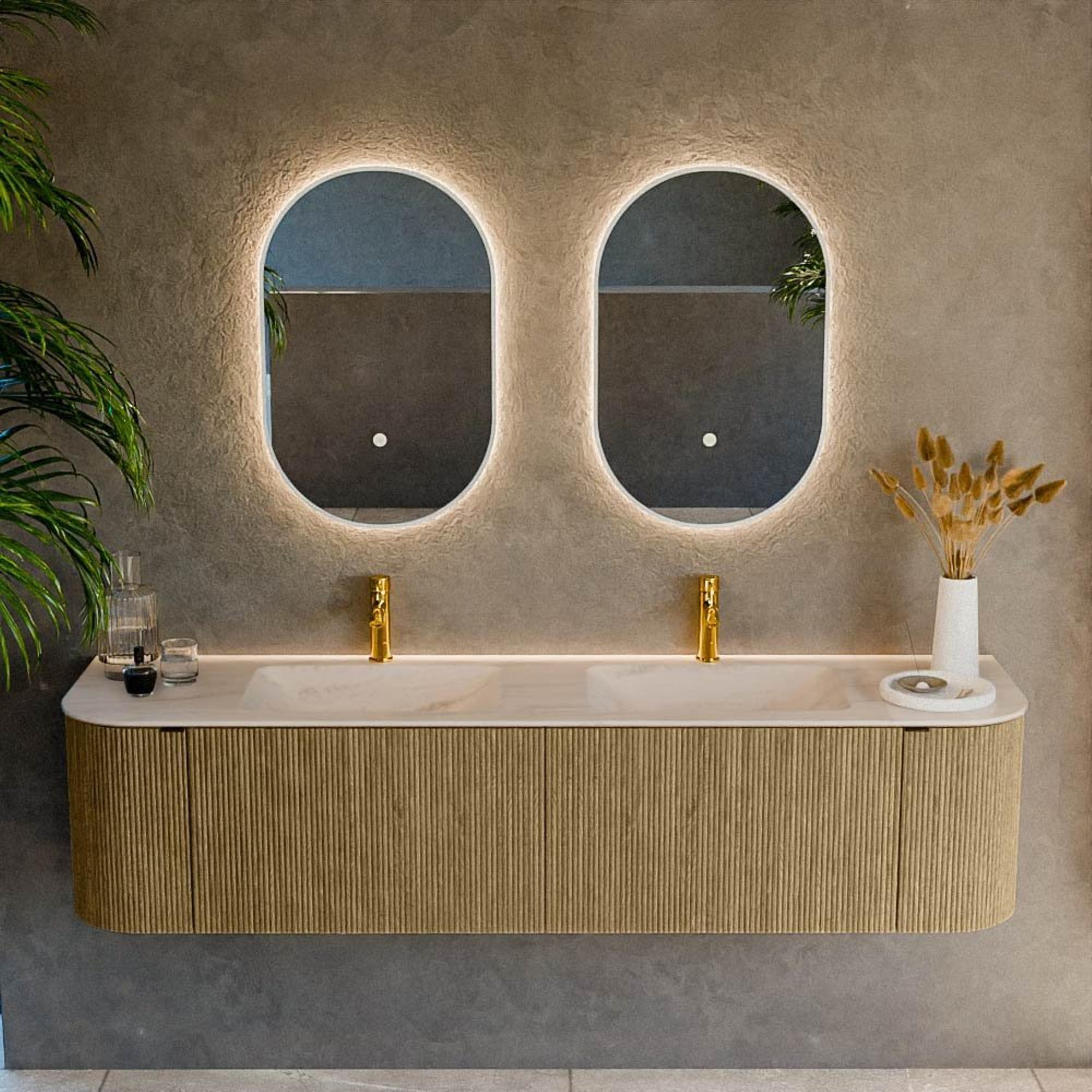 Avec ce meuble de salle de bains généreux, vous créez en une seule fois une base calme et luxueuse pour votre salle de bains. La largeur généreuse de 180 cm et l’aménagement astucieux avec à la fois des tiroirs et des portes rendent le meuble idéal pour les familles nombreuses, les couples qui veulent pouvoir se brosser les dents en même temps ou toute personne qui aime combiner beaucoup d’espace de rangement avec un design épuré. Les formes arrondies assurent une apparence douce et conviviale et rendent également la zone de passage un peu plus confortable, surtout dans les salles de bains plus étroites ou le long d’un couloir. La teinte bois chaude Dusk s’associe à merveille aux styles de salle de bains naturels, mais convient tout aussi bien à un cadre moderne ou de type hôtel de luxe. Grâce au lavabo double Leaf avec deux trous de robinet, vous pouvez facilement installer deux robinets, de sorte que vous ne vous gênez plus l’un l’autre pendant le rush du matin.