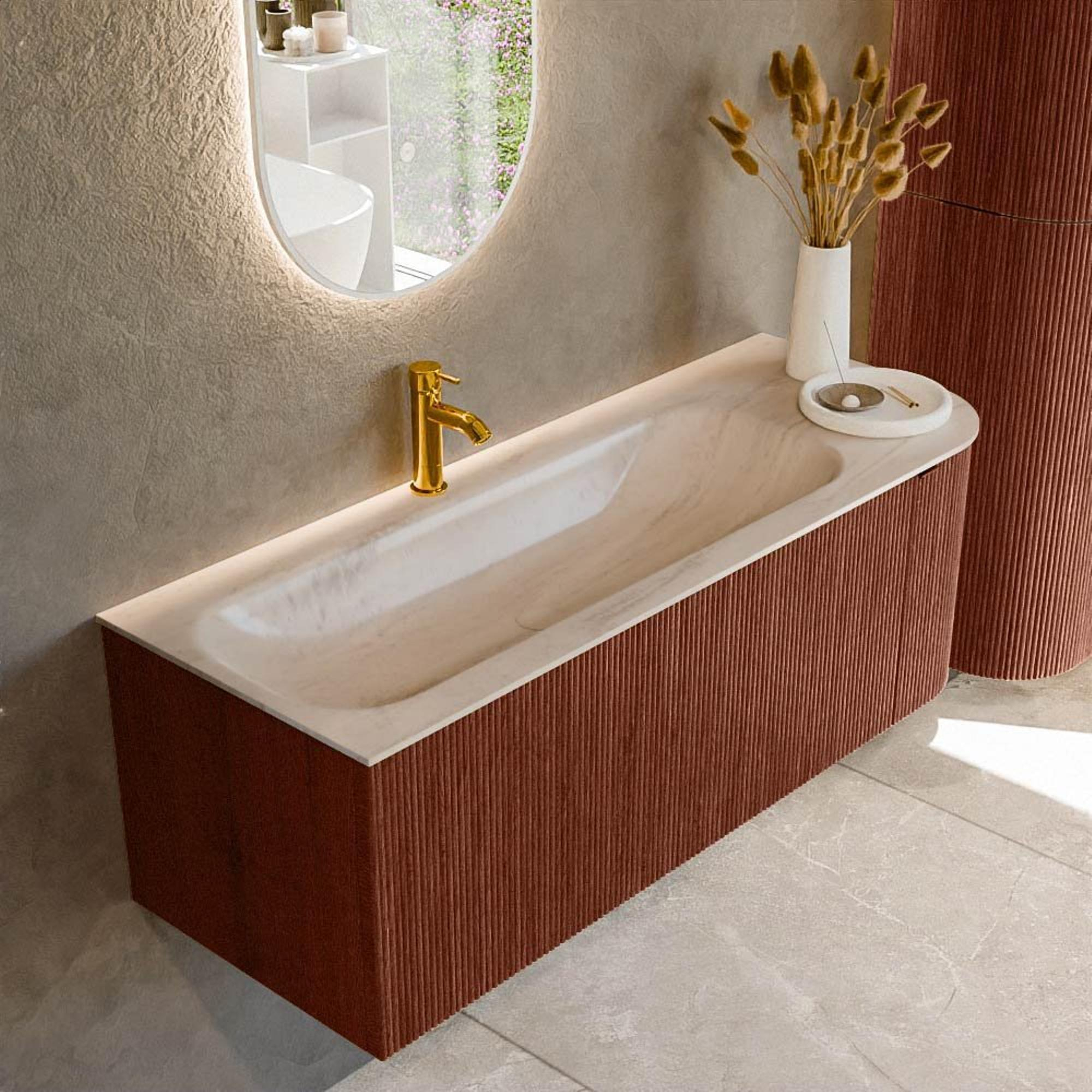 Si vous êtes à la recherche d'un meuble de salle de bains remarquable mais intemporel, qui offre à la fois design et facilité d'utilisation, alors cette combinaison est un choix judicieux. Avec sa largeur généreuse de 125 cm, son plan-vasque intégré et l'élégant arrondi sur le côté droit, ce meuble est idéal pour les salles de bains de taille moyenne à spacieuse, où vous aimez créer un effet marquant sans sacrifier la praticité. La couleur chaleureuse Ruby du meuble, combinée au calme du plan-vasque Meli, confère à votre salle de bains une ambiance d'hôtel de luxe. Grâce à la répartition bien pensée avec un tiroir et une porte, vous rangez vos objets du quotidien bien à l'abri des regards, tandis que la zone de la vasque à gauche offre beaucoup d'espace pour vous laver les mains, vous brosser les dents ou effectuer confortablement votre routine matinale. Ce meuble mural crée en outre une apparence légère et flottante et rend le nettoyage du sol beaucoup plus simple.