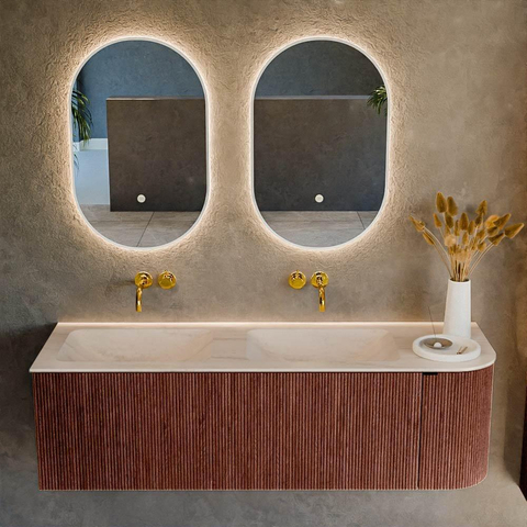 L'arrondi caractéristique sur le côté droit donne à ce meuble son jeu de lignes unique et tout en douceur. Idéal si vous avez un passage à côté du meuble ou si vous souhaitez accentuer un espace légèrement plus étroit sans angles vifs. La forme arrondie est accueillante et fait que vous vous cognez moins facilement dans un passage étroit. La couleur Ruby du meuble est une teinte rouge profonde et chaleureuse qui donne immédiatement à votre salle de bains une allure exclusive et axée sur le design. Combinée à la structure à nervures verticales sur les façades, elle crée un bel effet 3D qui respire le luxe et fait de ces meubles de véritables accroche-regards. Comme le meuble est suspendu au mur, il semble flotter optiquement, ce qui agrandit visuellement l'espace et se marie parfaitement avec des sols clairs et des carreaux modernes. Vous créez ainsi facilement un look de salle de bains cohérent et élégant qui restera d'actualité pendant de nombreuses années.