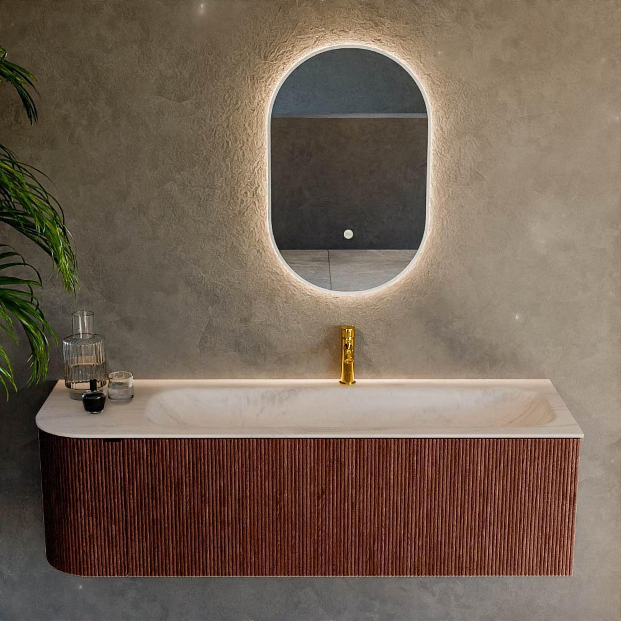 La combinaison de la courbe élégante à gauche et de la couleur Ruby affirmée fait de ce meuble un véritable élément design. Les façades avec structure nervurée verticale apportent une profondeur et une nuance supplémentaires, ce qui attire immédiatement le regard sans devenir criard. Le côté arrondi n’est pas seulement esthétique, mais aussi pratique : aucun angle vif contre lequel vous cogner, idéal dans une zone de passage ou en présence d’enfants. La teinte rouge chaude se marie très bien avec des carreaux neutres, des robinets noirs ou en laiton et des matériaux naturels comme le bois et la pierre. Vous créez ainsi sans effort une ambiance d’hôtel de luxe dans votre propre salle de bains, tout en bénéficiant d’un meuble au design suffisamment intemporel pour durer des années.