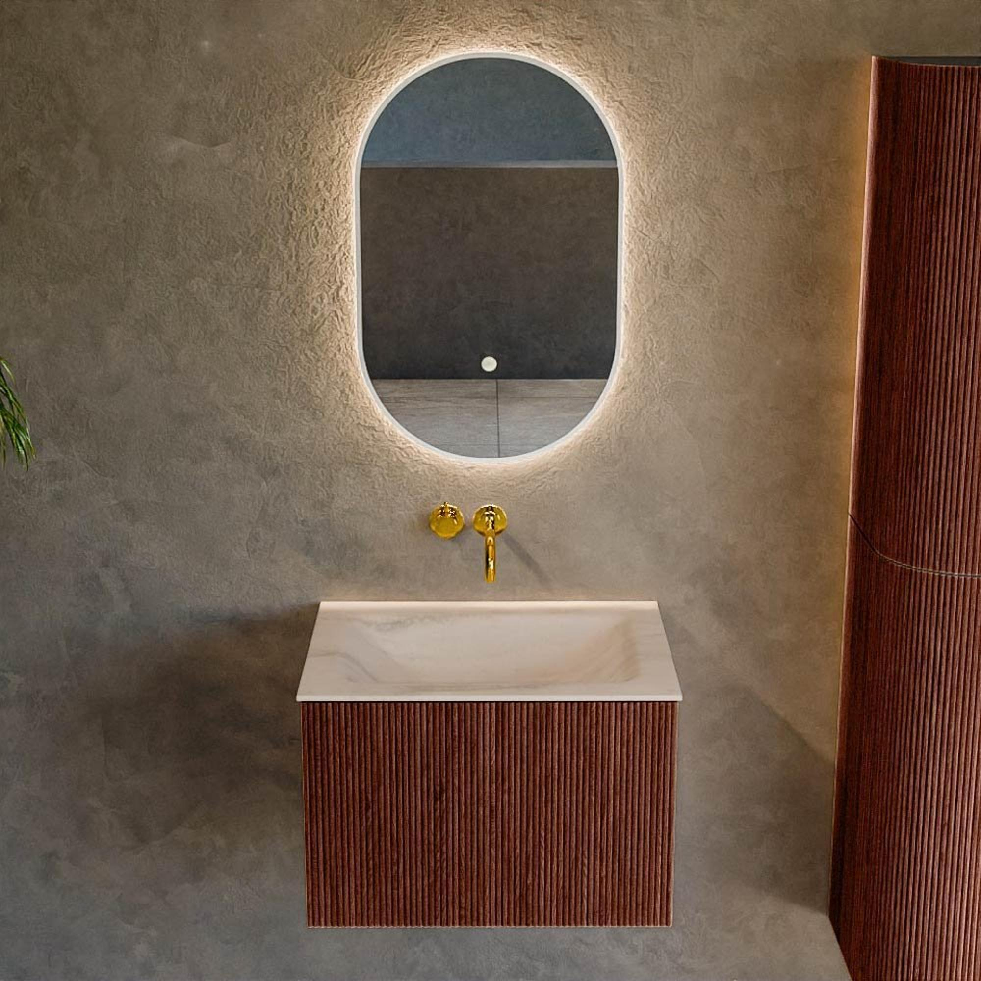 Avec ce meuble de salle de bains compact et élégant, vous créez en une seule fois un élément de luxe qui attire le regard et un espace de rangement pratique dans votre salle de bains. Grâce à sa largeur réduite, c'est un choix parfait pour les petites à moyennes salles de bains, mais aussi pour les grands toilettes ou la chambre d'amis élégante. La couleur chaude Ruby donne immédiatement du caractère à la pièce, tandis que les lignes épurées s'accordent parfaitement avec les salles de bains modernes, design et de style hôtel chic. Le lavabo intégré sans trou de robinet offre une totale liberté pour choisir un beau mitigeur posé ou encastré, afin que vous puissiez appliquer entièrement votre propre style. Si vous recherchez un meuble qui non seulement est magnifique, mais qui donne également une impression de solidité et supporte sans effort une utilisation quotidienne, cette solution correspond parfaitement à vos attentes.