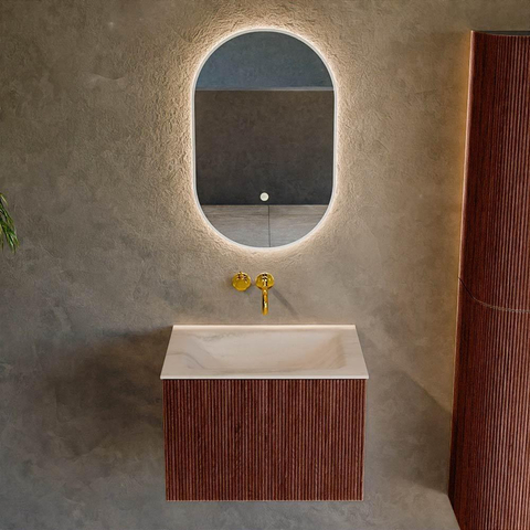 La teinte profonde Ruby fait de ce meuble de salle de bains un véritable accroche-regard. En combinaison avec la façade à relief, votre salle de bains obtient immédiatement une apparence plus luxueuse, presque de type boutique. La structure verticale des façades crée un jeu de lignes ludique qui contraste joliment avec un mur carrelé épuré ou un sol aspect béton sobre. Grâce à la largeur compacte de 60 cm, le meuble paraît raffiné mais néanmoins complet. La couleur Ruby se marie en outre très bien avec des robinets et accessoires noirs, laiton ou chromés, ce qui vous permet de créer facilement un ensemble harmonieux. Vous apportez ainsi chaleur et personnalité à la pièce, sans que cela ne devienne trop chargé.