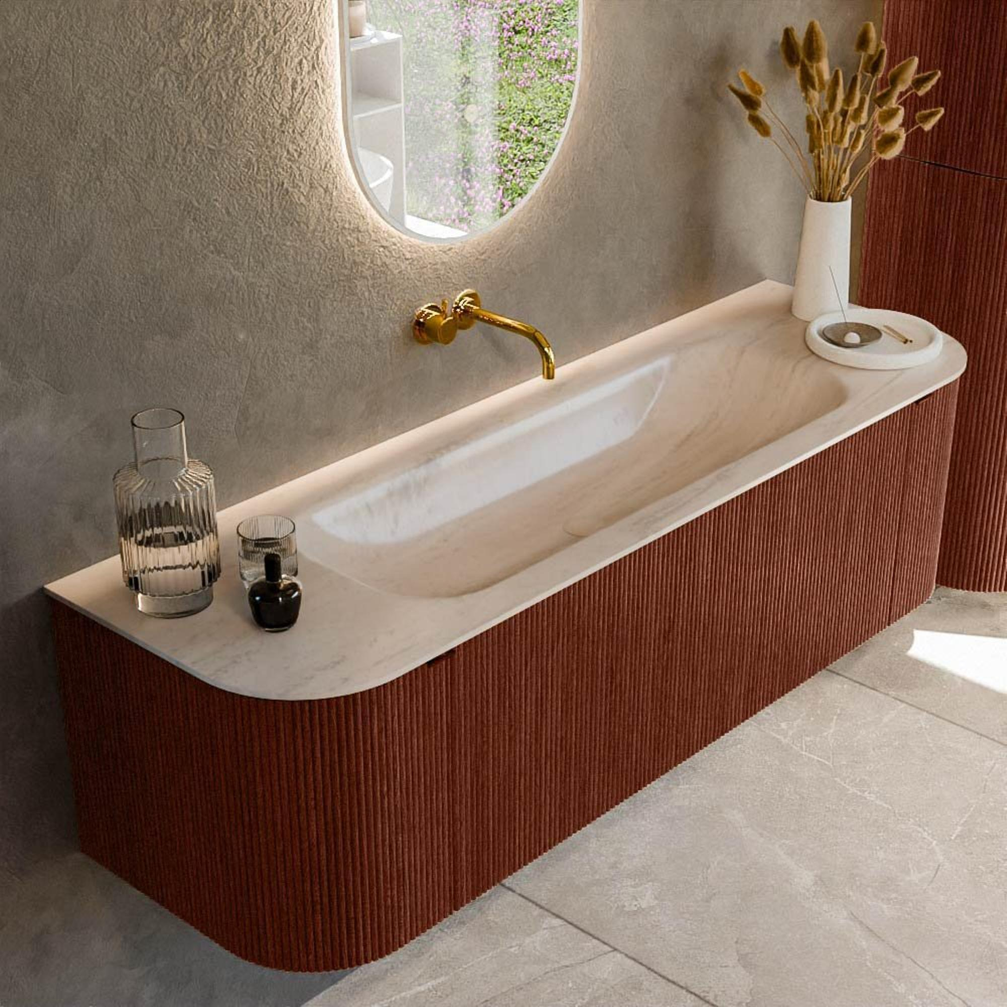 Les formes arrondies des côtés gauche et droit créent une ligne fluide dans votre salle de bains, ce qui n'est pas seulement sûr et peu encombrant, mais confère également immédiatement une apparence haut de gamme. La couleur Ruby attire le regard sans être criarde et se combine à merveille avec des robinets et accessoires noirs, chromés ou dorés. Grâce à la structure rainurée à l'avant, le meuble gagne en profondeur et en caractère, ce qui donne à l'ensemble un look exclusif et digne d'un design haut de gamme. Le montage mural flottant laisse le sol libre, ce qui donne une impression plus spacieuse à votre salle de bains et facilite le nettoyage. Vous ajoutez ainsi sans effort, avec ce meuble, un élément accrocheur et élégant à une salle de bains moderne, style hôtel chic ou à une salle de bains chaleureuse et naturelle.