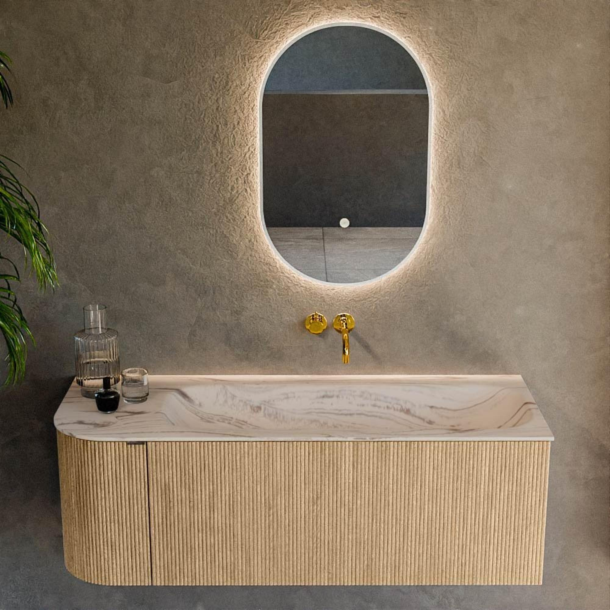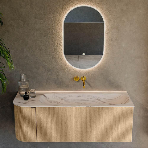 Le côté gauche arrondi donne au meuble une forme élégante et fluide qui attire immédiatement le regard. Cette courbe n’est pas seulement esthétique, mais aussi pratique : pas d’angles vifs le long du passage, ce qui est agréable dans les petites salles de bains ou avec des enfants. La couleur chêne avec structure nervurée verticale sur les façades apporte davantage de profondeur et de caractère, faisant de l’armoire un véritable point de mire contre un mur de carrelage sobre. Grâce à la combinaison avec le lavabo de couleur nata, on obtient un contraste subtil qui ajoute lumière et chaleur, sans être trop criard. Vous créez ainsi sans effort un look digne d’un hôtel, tout en restant suffisamment intemporel pour suivre pendant des années l’évolution des tendances salle de bains.