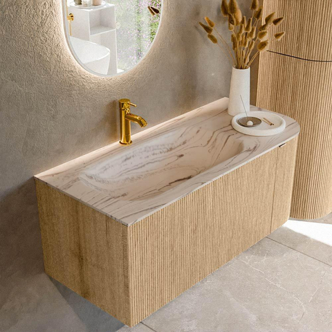 Les façades couleur chêne avec structure nervurée verticale confèrent au meuble une apparence luxueuse et meuble de designer que l’on s’attendrait plutôt à trouver dans un hôtel design que dans une salle de bains standard. La texture capte subtilement la lumière et crée une profondeur supplémentaire dans la pièce. Le plan de lavabo est réalisé en solid surface, couleur Nata : une teinte douce et raffinée qui se marie à merveille avec les accents en bois et les carreaux blancs ou couleur sable. Le solid surface est réputé pour son aspect épuré, son toucher agréable et sa facilité de nettoyage, idéal pour un usage quotidien. Avec le lavabo à gauche et un trou de robinet, vous disposez d’une zone de lavage claire et pratique, tandis qu’il reste sur la droite de la place pour poser des accessoires ou un distributeur de savon.