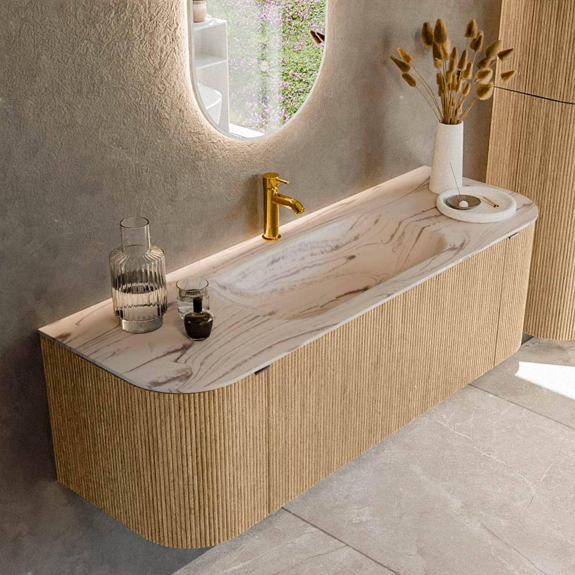 MONDIAZ KURVE-DLUX 140cm badmeubel ronding Links + Rechts kleur Oak met 1 lade en 2 deuren. Wastafel BIG SMALL Midden 1 kraangat Nata.