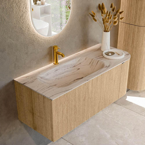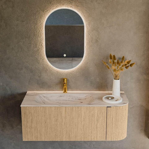 La couleur naturelle Oak donne immédiatement à votre salle de bains une atmosphère chaleureuse et accueillante. La façade est dotée d’un profil nervuré vertical, ce qui offre une apparence architecturale luxueuse et un subtil jeu de lumière et d’ombre. L’arrondi droit adoucit les lignes dans l’espace et rend le meuble idéal à côté d’un passage ou dans un chemin de circulation un peu plus étroit : vous vous cognez moins facilement contre un angle vif. Grâce à la forme de base rectangulaire avec angles arrondis, vous combinez lignes droites et formes douces, ce qui s’accorde très bien avec des robinets modernes, des miroirs ronds et des accessoires noirs mats ou brossés.