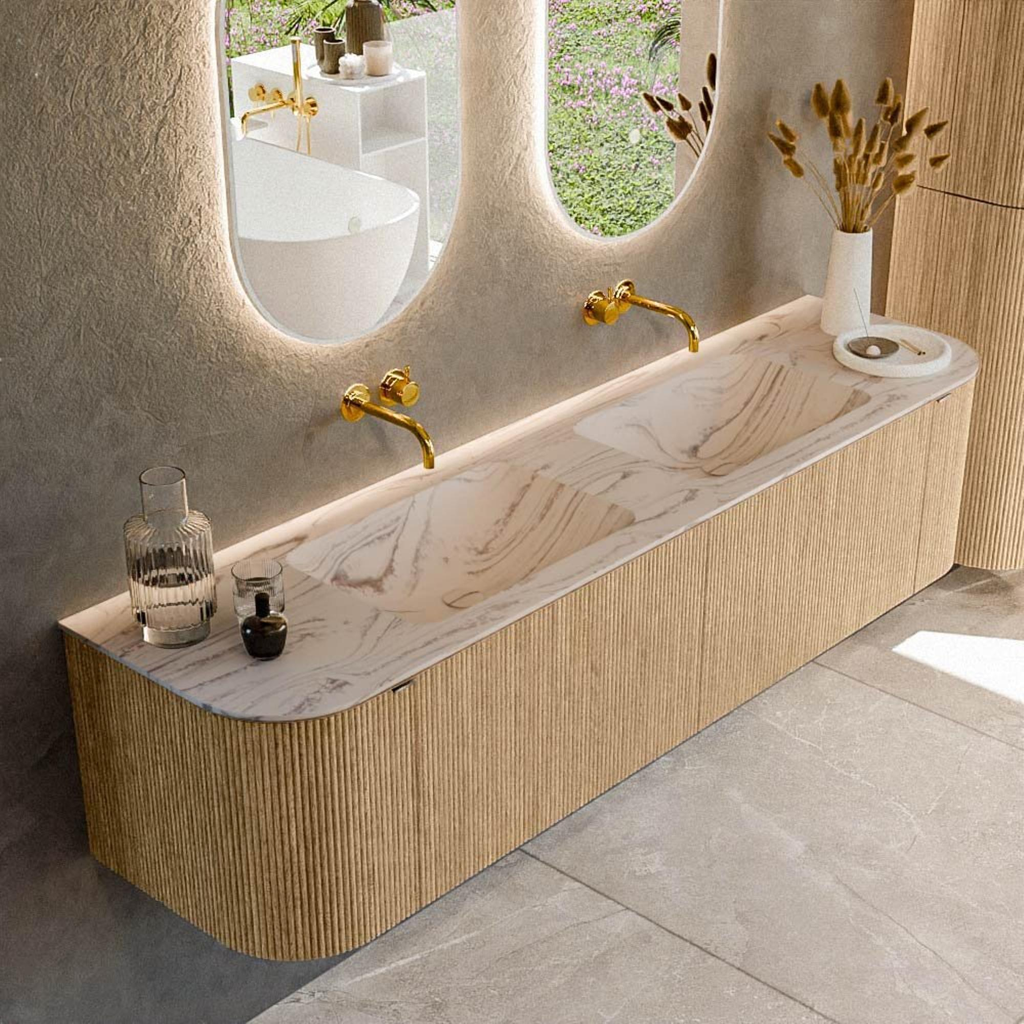 MONDIAZ KURVE-DLUX Meuble de salle de bains 180cm arrondi gauche + droite couleur chêne avec 2 tiroirs et 2 portes. Lavabo LEAF double sans trou de robinet Nata.