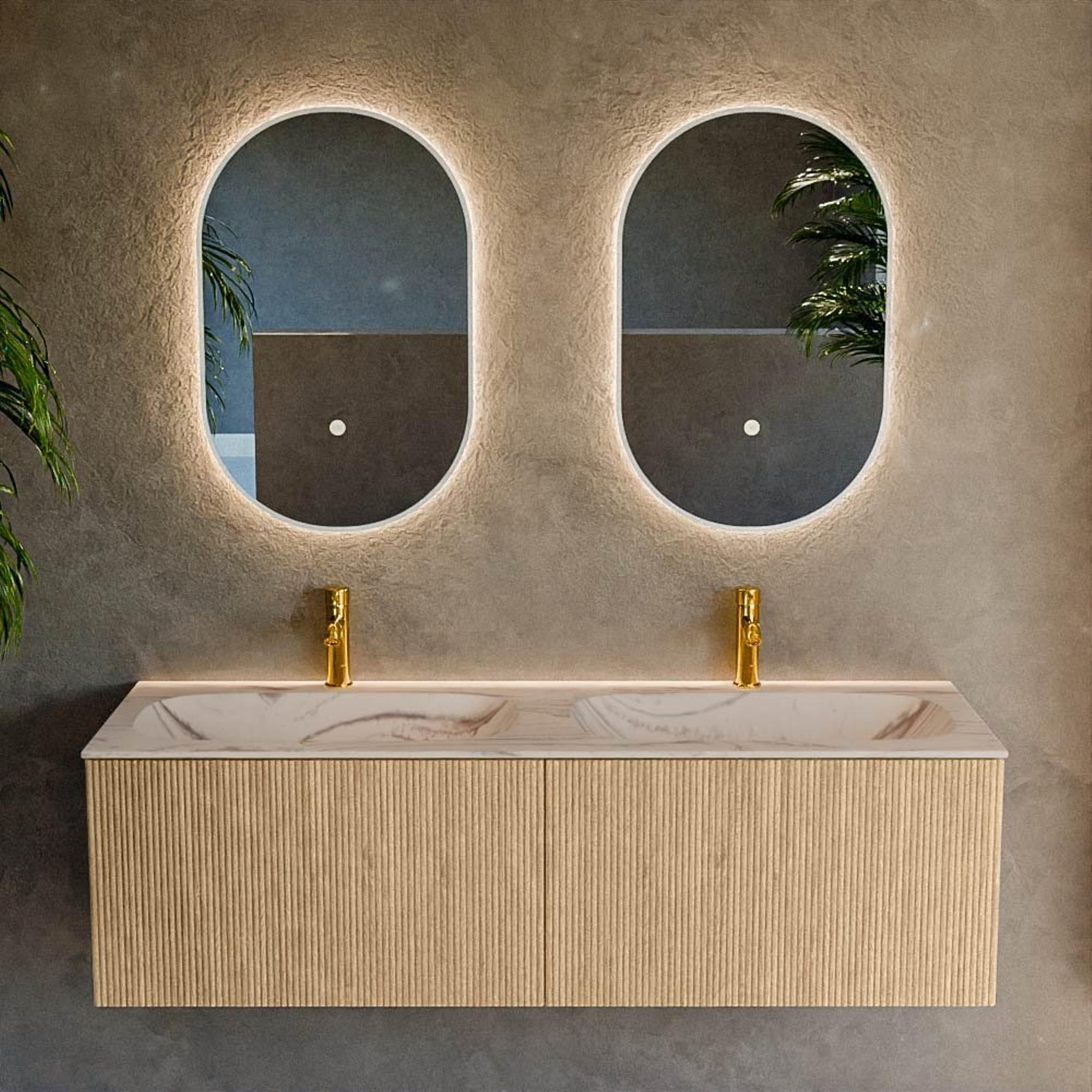 La couleur Oak chaleureuse du meuble, combinée à la couleur Nata du lavabo, crée un look chic et doux qui apporte immédiatement de l'ambiance à votre salle de bains. La structure verticale à nervures sur la façade donne plus de profondeur et de caractère, sans paraître chargée. Cette texture s'accorde parfaitement avec les tendances actuelles en matière d'intérieur et donne au meuble l'apparence d'une solution de fabrication sur mesure luxueuse. Le double lavabo avec deux trous de robinet offre une image symétrique et apaisante, surtout si vous y placez deux mitigeurs de lavabo identiques. Cette combinaison fait du meuble un véritable accroche-regard, sans que cela ne se fasse au détriment de la fonctionnalité.