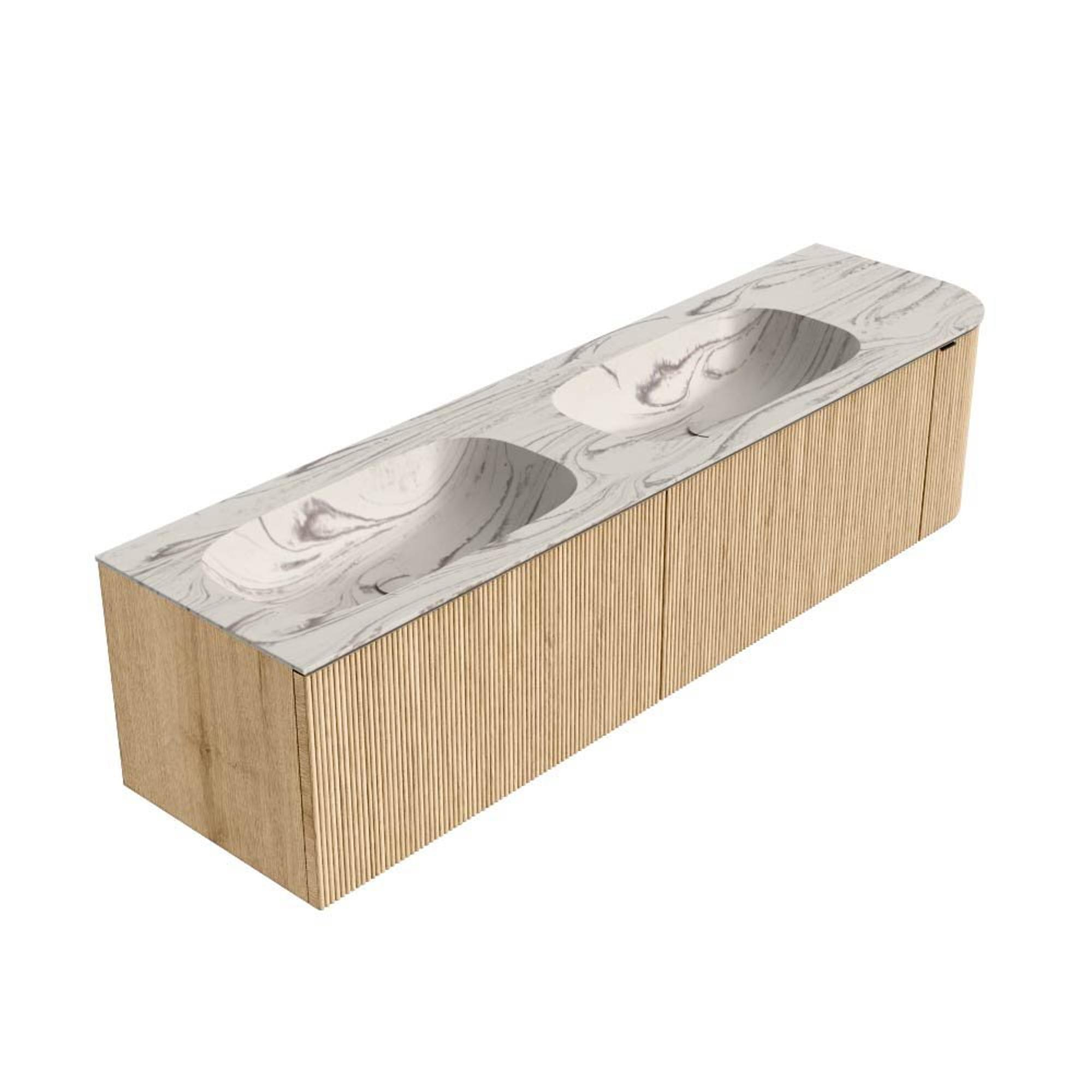Le meuble présente une forme rectangulaire épurée avec des angles arrondis et une élégante courbure à droite, ce qui crée une ligne de circulation plus douce le long du meuble. Cela n’est pas seulement plus sûr pour entrer et sortir de la salle de bains, mais confère également immédiatement une apparence élégante et haut de gamme. La couleur chêne (Oak) avec structure à nervures verticales sur les façades apporte une profondeur et un caractère supplémentaires, faisant du meuble un véritable élément phare. Associez-le à un miroir minimaliste ou à une armoire de toilette pour prolonger la ligne et donner à votre salle de bains une impression d’espace encore plus grande.