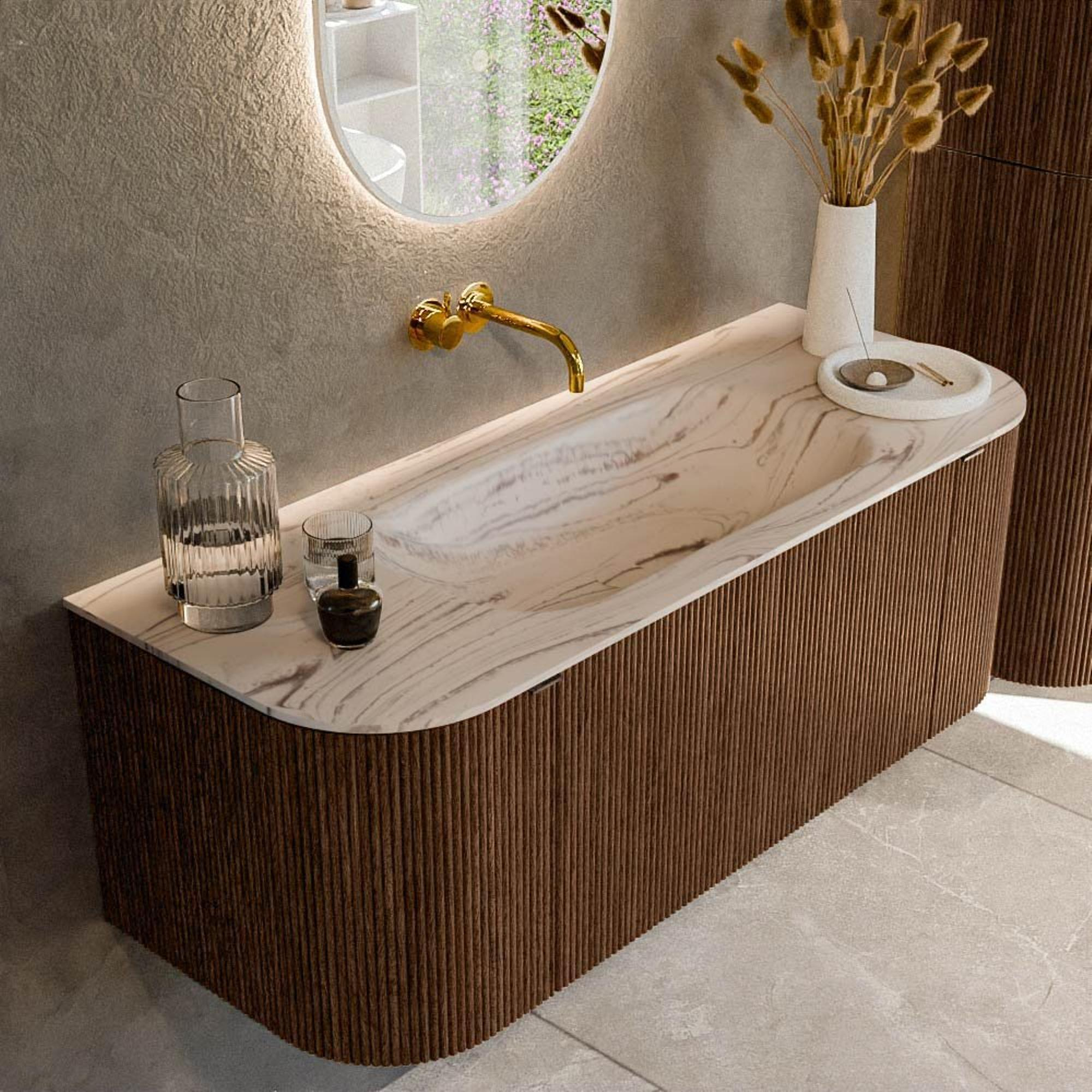 Les angles arrondis à gauche et à droite confèrent à ce meuble un caractère élégant et organique qui attire immédiatement le regard lorsque vous entrez dans la salle de bains. Là où de nombreux meubles rectangulaires paraissent assez stricts et anguleux, les courbes adoucissent ici l’espace, rendant la salle de bains plus accueillante et invitante. La couleur noyer avec structure cannelée verticale sur les façades ajoute une profondeur et un luxe supplémentaires : la lumière joue joliment sur la surface et donne au meuble une apparence exclusive. Le lavabo couleur Nata forme un contrepoint clair et apaisant au bois, ce qui crée un ensemble équilibré. Cela rend l’ensemble idéal si vous souhaitez créer une atmosphère de spa ou donner à votre salle de bains existante une mise à niveau élégante sans faire de compromis sur la fonctionnalité.