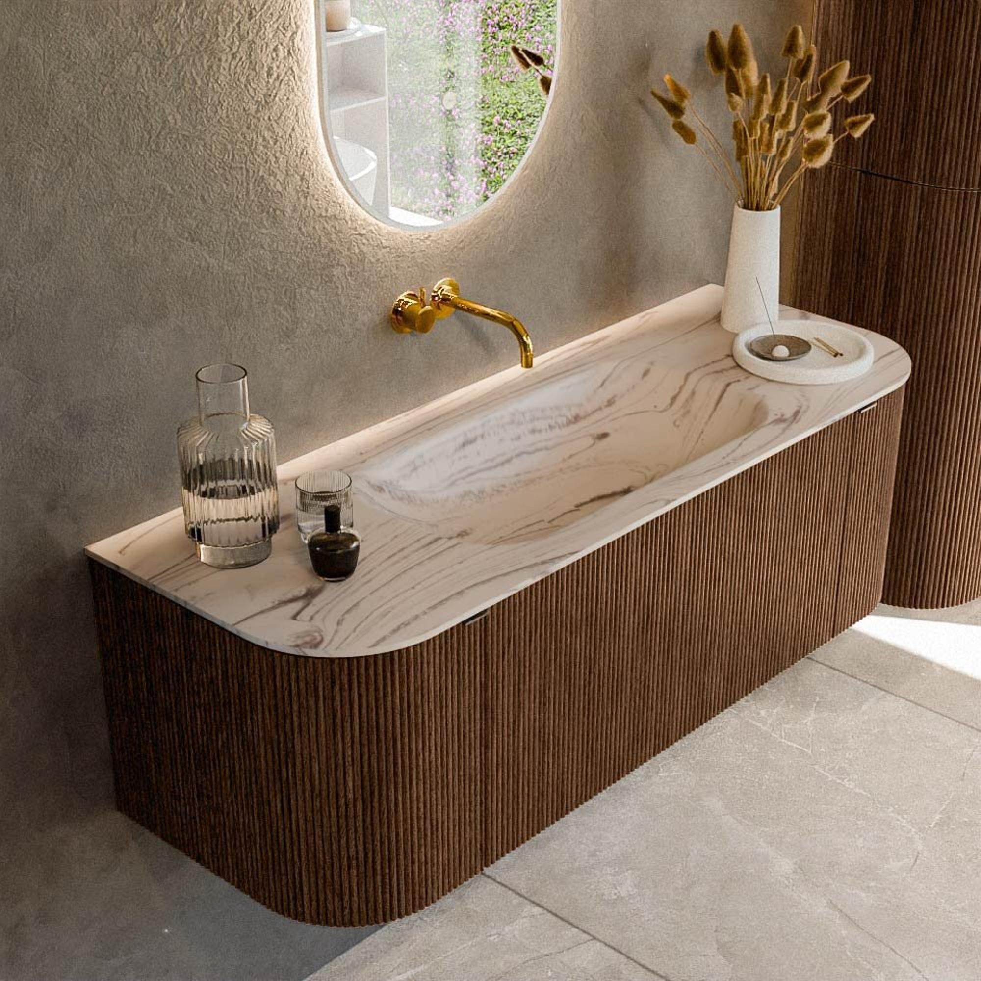 MONDIAZ KURVE-DLUX 130cm badmeubel ronding Links + Rechts kleur Walnut met 1 lade en 2 deuren. Wastafel BIG SMALL Midden zonder kraangat Nata.