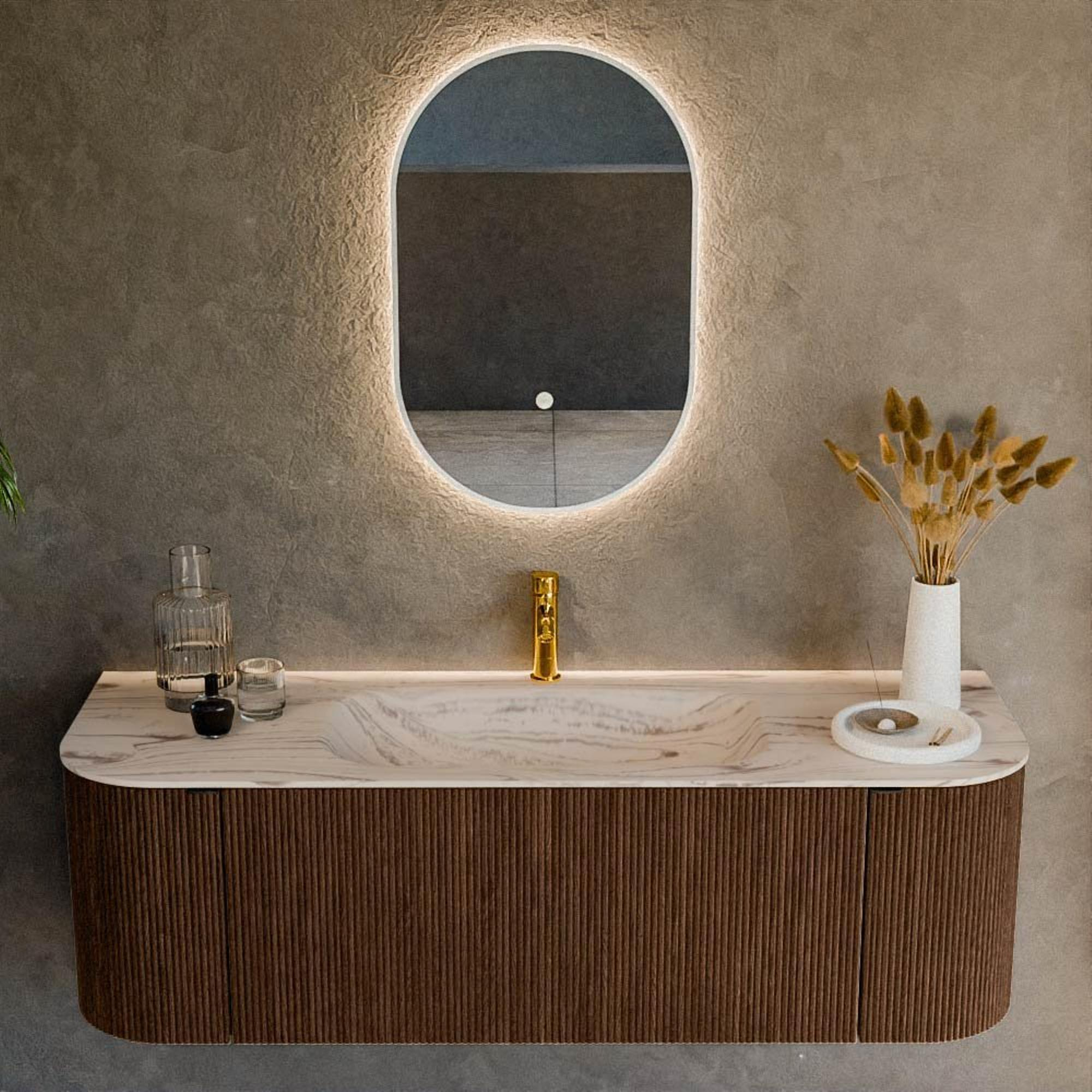 La couleur walnut avec structure bois donne immédiatement à votre salle de bains une apparence haut de gamme et chaleureuse. La façade nervurée avec lignes verticales offre un aspect luxueux et design que l'on retrouve habituellement dans les hôtels haut de gamme et les magazines de décoration intérieure. Comme les angles gauche et droit sont joliment arrondis, le meuble paraît plus fin et plus fluide le long du mur, ce qui fait une grande différence surtout le long d'un long mur ou dans un espace plutôt étroit. La combinaison avec le lavabo Nata clair crée un contraste moderne : bois chaud en bas, ton clair et frais en haut. Ainsi, ce meuble s'intègre sans effort dans différents styles, du scandinave et minimaliste au japandi et au moderne industriel.