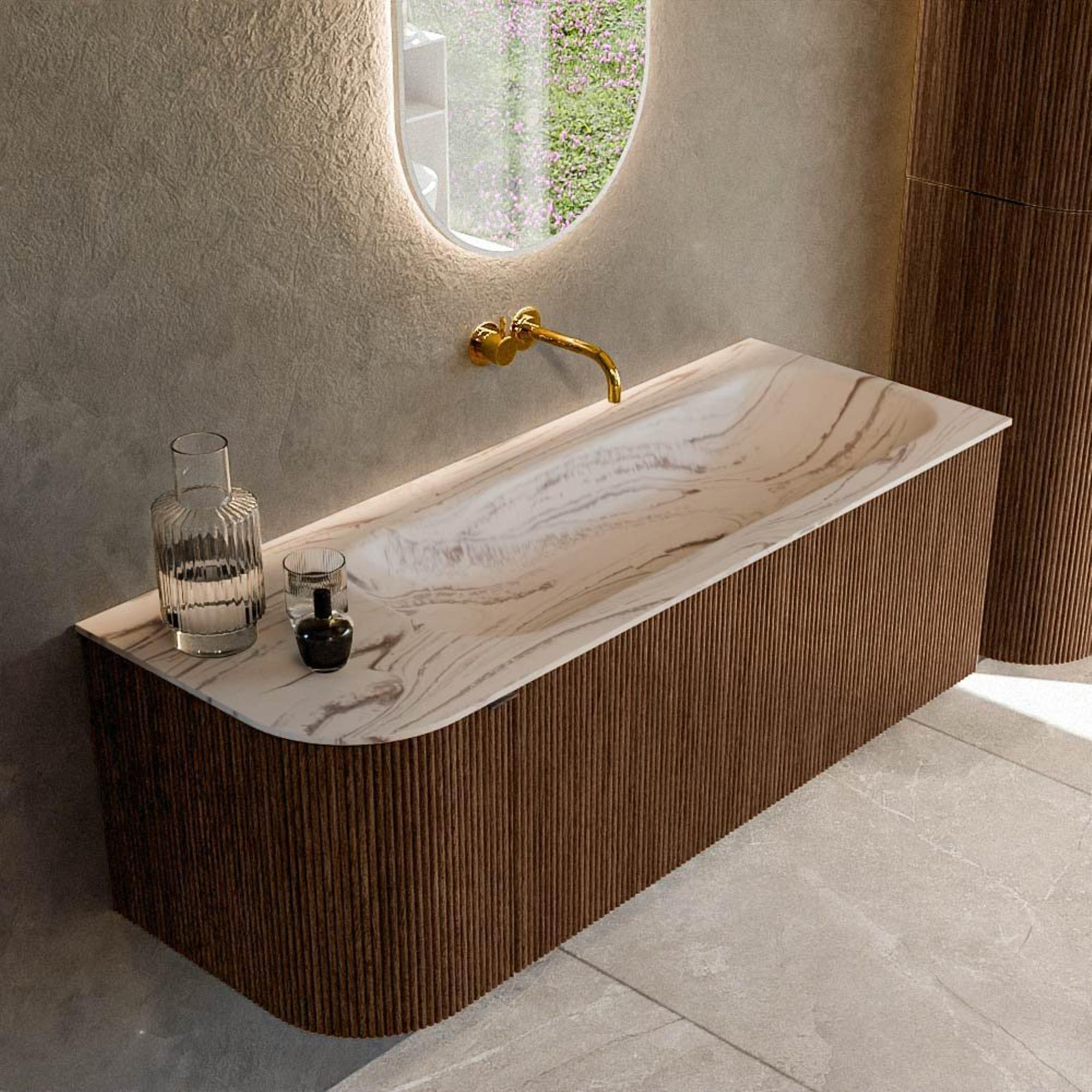 La forme arrondie à gauche n’est pas seulement un détail de design élégant, mais aussi fonctionnel : vous vous cognez moins facilement contre un angle et la salle de bains paraît immédiatement plus douce et plus spacieuse. La couleur noyer avec structure nervurée verticale sur la façade offre une apparence luxueuse, proche d’un véritable meuble, qui élève votre salle de bains au niveau d’un hôtel design. Comme ce meuble est fixé directement au mur, le sol reste libre et l’espace semble optiquement plus grand et plus lumineux, surtout en combinaison avec un grand miroir. L’association de l’aspect bois avec la couleur douce Nata du lavabo crée un look moderne mais intemporel que vous pouvez facilement compléter avec des robinets et accessoires noirs, couleur chrome ou en métal brossé. Ainsi, vous posez avec un seul meuble les bases d’un style de salle de bains cohérent et bien pensé.