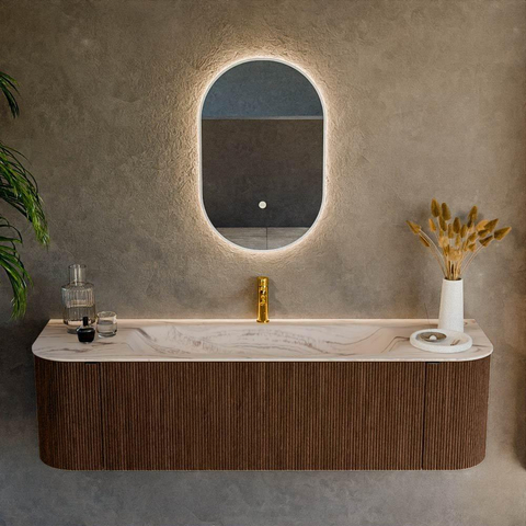 Les côtés arrondis à gauche et à droite donnent à ce meuble une forme fluide et unique qui attire immédiatement l’attention, tout en restant apaisante. L’aspect bois couleur walnut s’accorde parfaitement avec les tendances comme les salles de bains esprit spa et les intérieurs naturels, et se marie facilement avec des accents blancs, beiges ou au contraire noirs. La structure à nervures verticales sur les façades crée une profondeur supplémentaire et une sensation de luxe, ce qui permet au meuble de paraître chaleureux et plein de caractère même dans une salle de bains épurée et minimaliste. Comme le lavabo est placé au centre, la forme reste symétrique et équilibrée, ce qui contribue à une atmosphère sereine dans toute la salle de bains.