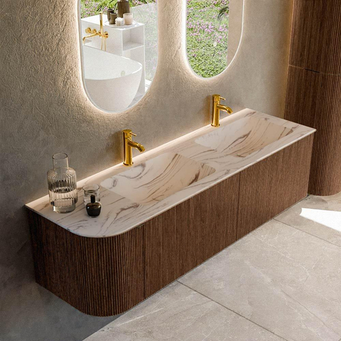 La couleur walnut avec structure à nervures verticales sur les façades offre une apparence luxueuse et proche du meuble de séjour, parfaitement adaptée aux salles de bains contemporaines. Les coins arrondis adoucissent les lignes de l’espace et rendent l’ensemble plus accueillant et plus élégant qu’un meuble rectangulaire standard. Le design sans poignées avec système push-to-open renforce le look minimaliste : aucune poignée visible, uniquement des surfaces sobres et de belles veines de bois. Combinée à la vasque crème en Solid Surface, il en résulte une apparence naturelle et intemporelle qui se marie parfaitement avec des robinets et accessoires noirs, chromés ou en métal brossé.