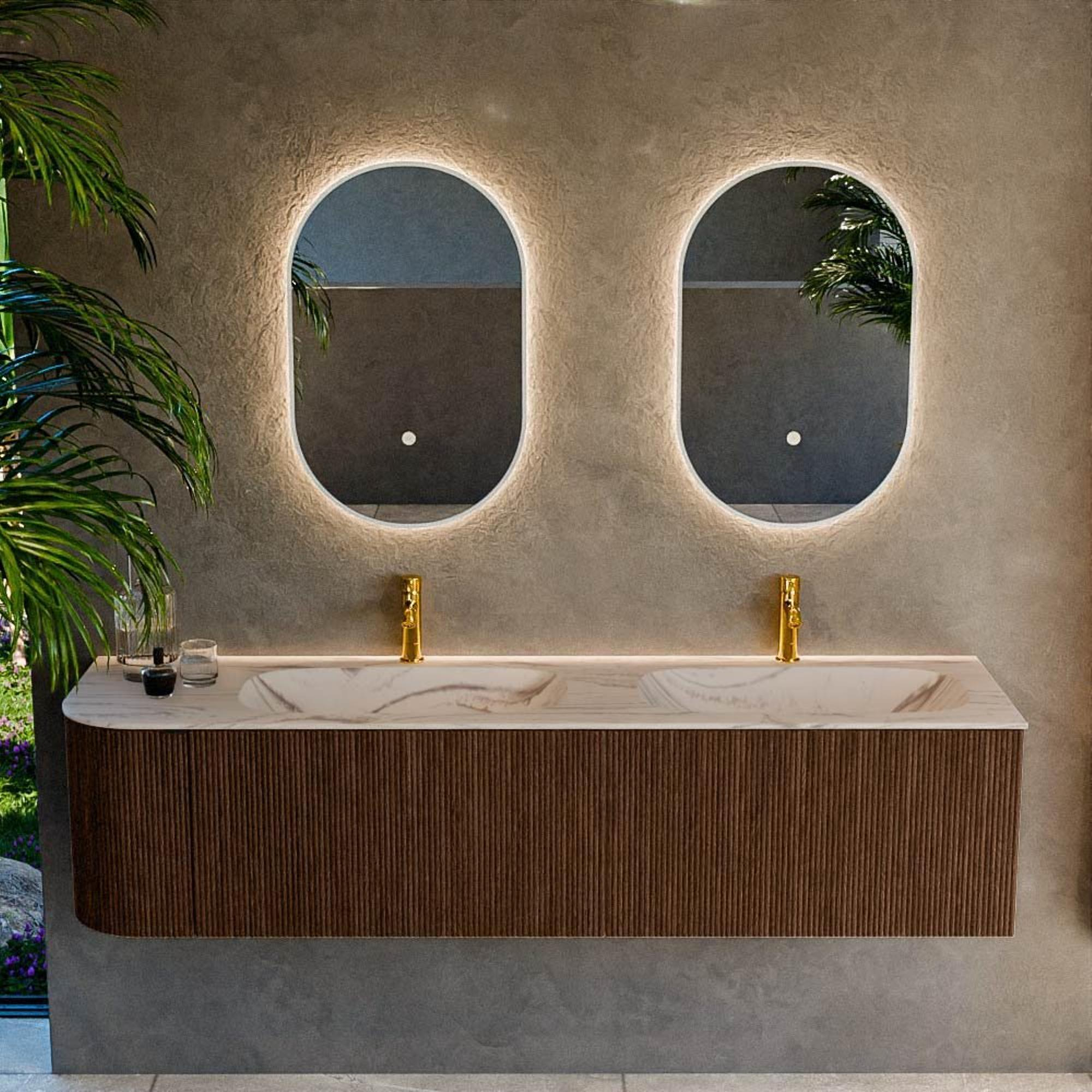 La ligne droite du meuble est joliment rompue par la forme arrondie sur le côté gauche, ce qui donne une apparence plus douce et plus accueillante qu’un meuble de salle de bains rectangulaire standard. La couleur Walnut avec structure rainurée verticale sur les façades apporte profondeur et texture, donnant immédiatement plus de luxe et une ambiance hôtel à votre salle de bains. La combinaison avec le plan de lavabo clair Nata crée un contraste élégant : bois chaud en dessous, ton clair et frais au-dessus. Grâce aux angles arrondis, l’ensemble paraît moins massif, idéal si vous souhaitez une composition large sans que l’espace ne semble plus petit.