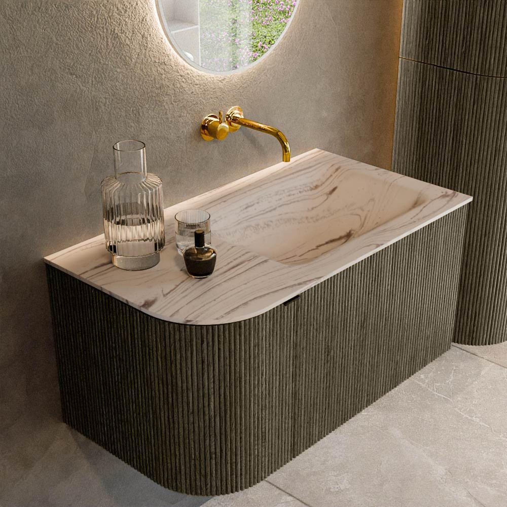 La forme arrondie sur le côté gauche donne au meuble une allure raffinée, presque organique, ce qui le rend visuellement moins massif au mur et confère immédiatement à votre salle de bains une atmosphère plus spacieuse et plus accueillante. La couleur Shadow en combinaison avec la façade à nervures verticales crée un effet luxueux et haut de gamme qui rappelle les projets d’intérieur exclusifs. Comme le meuble est suspendu au mur, le sol reste libre et l’espace paraît aéré et ordonné, ce qui fait une grande différence surtout dans les petites salles de bains. La solution sans poignée avec système push-to-open renforce le look épuré : aucune poignée saillante, mais une façade lisse parfaitement alignée. Vous créez ainsi une base élégante et intemporelle que vous pourrez associer sans effort pendant des années aux tendances changeantes en matière de carrelages, de robinets et d’accessoires.