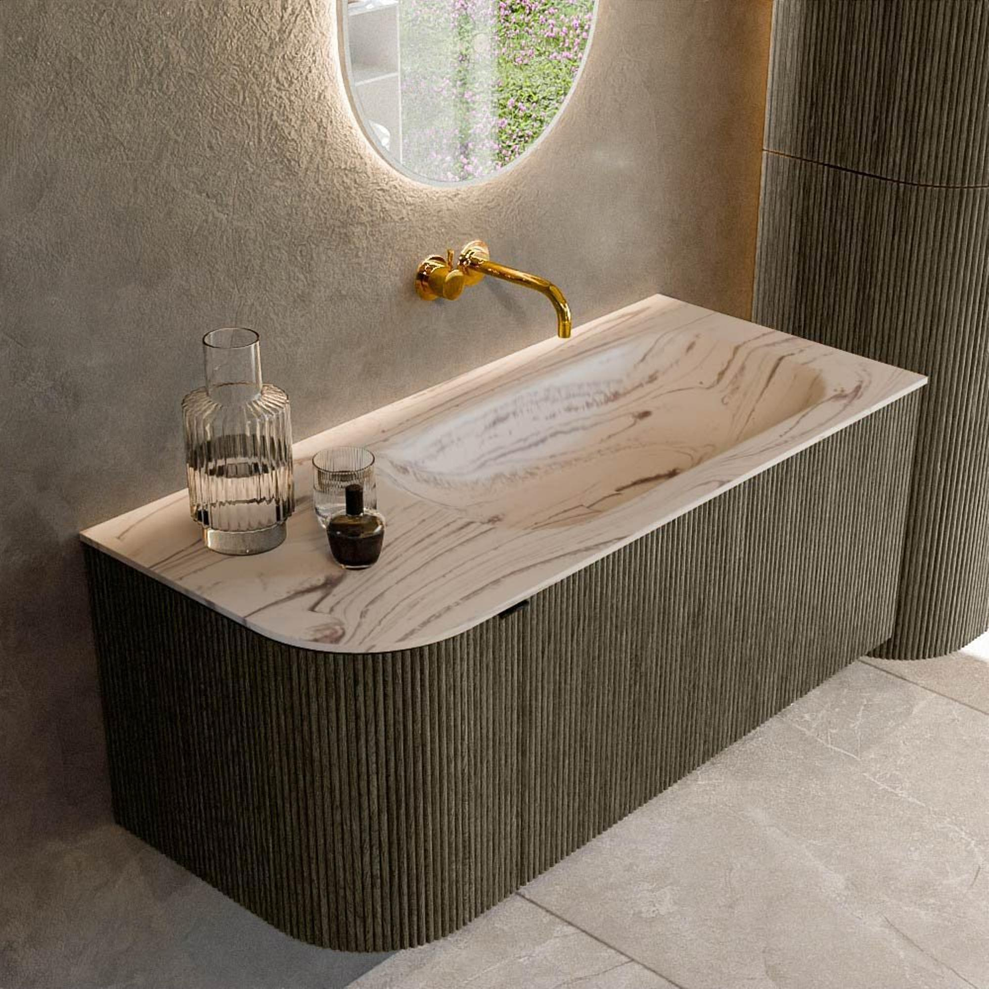 La structure à rainures verticales sur les façades confère au meuble une allure luxueuse et quasi mobilier que l’on retrouve plutôt dans un intérieur haut de gamme que dans une salle de bains standard. La couleur Shadow est un ton de gris profond qui dégage chaleur et sérénité, et qui se combine facilement avec des carreaux clairs comme foncés. En l’absence de poignées apparentes et grâce au système d’ouverture push-to-open, l’ensemble reste sobre et minimaliste. La forme arrondie sur le côté gauche adoucit les lignes dans la pièce, ce qui est particulièrement appréciable dans les petites salles de bains : pas d’angles vifs le long desquels vous passez, mais une forme fluide et accueillante. Vous créez ainsi un look moderne et intemporel qui ne se démode pas de sitôt.