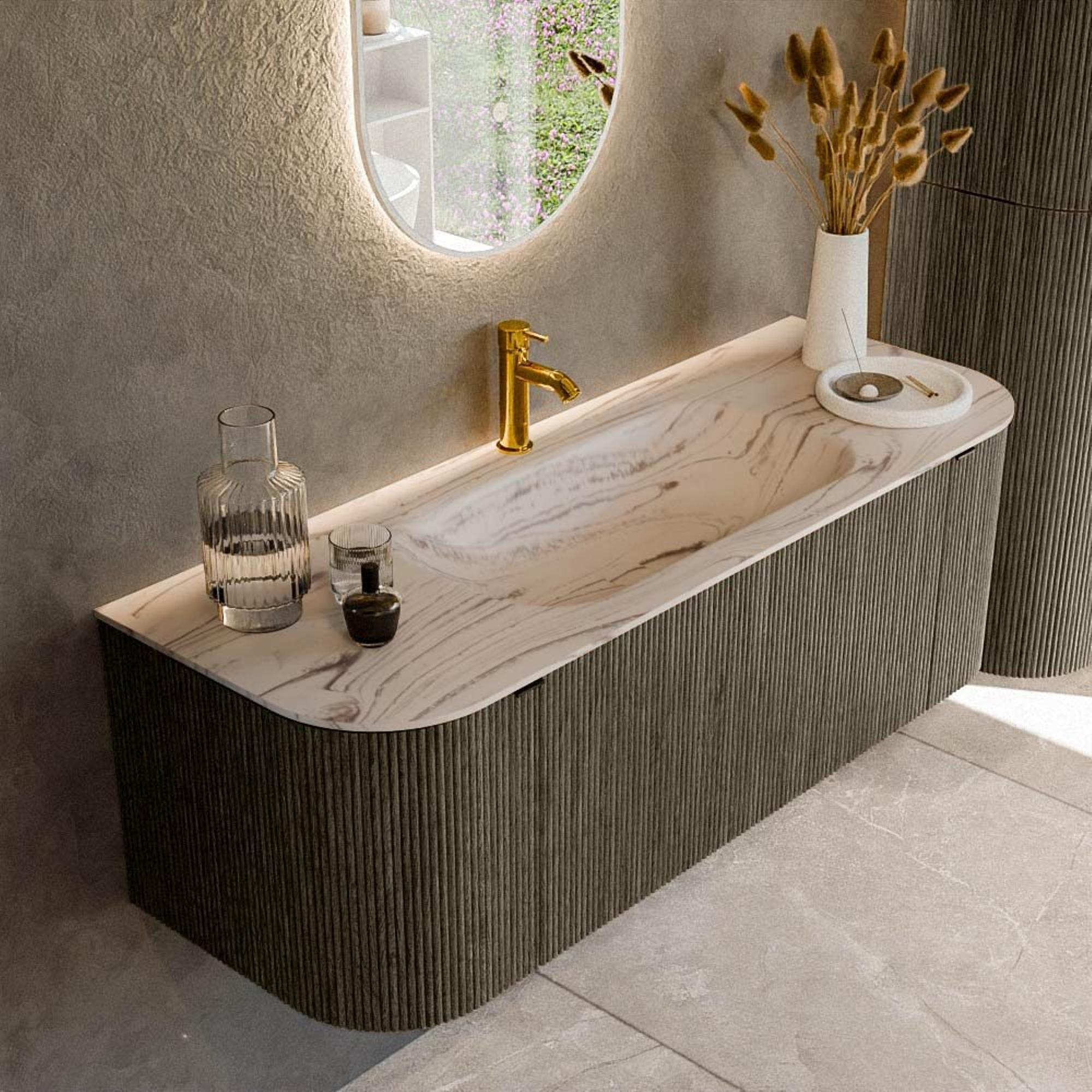 - Meuble de salle de bains avec façades cannelées verticales pour un caractère luxueux, proche du mobilier.