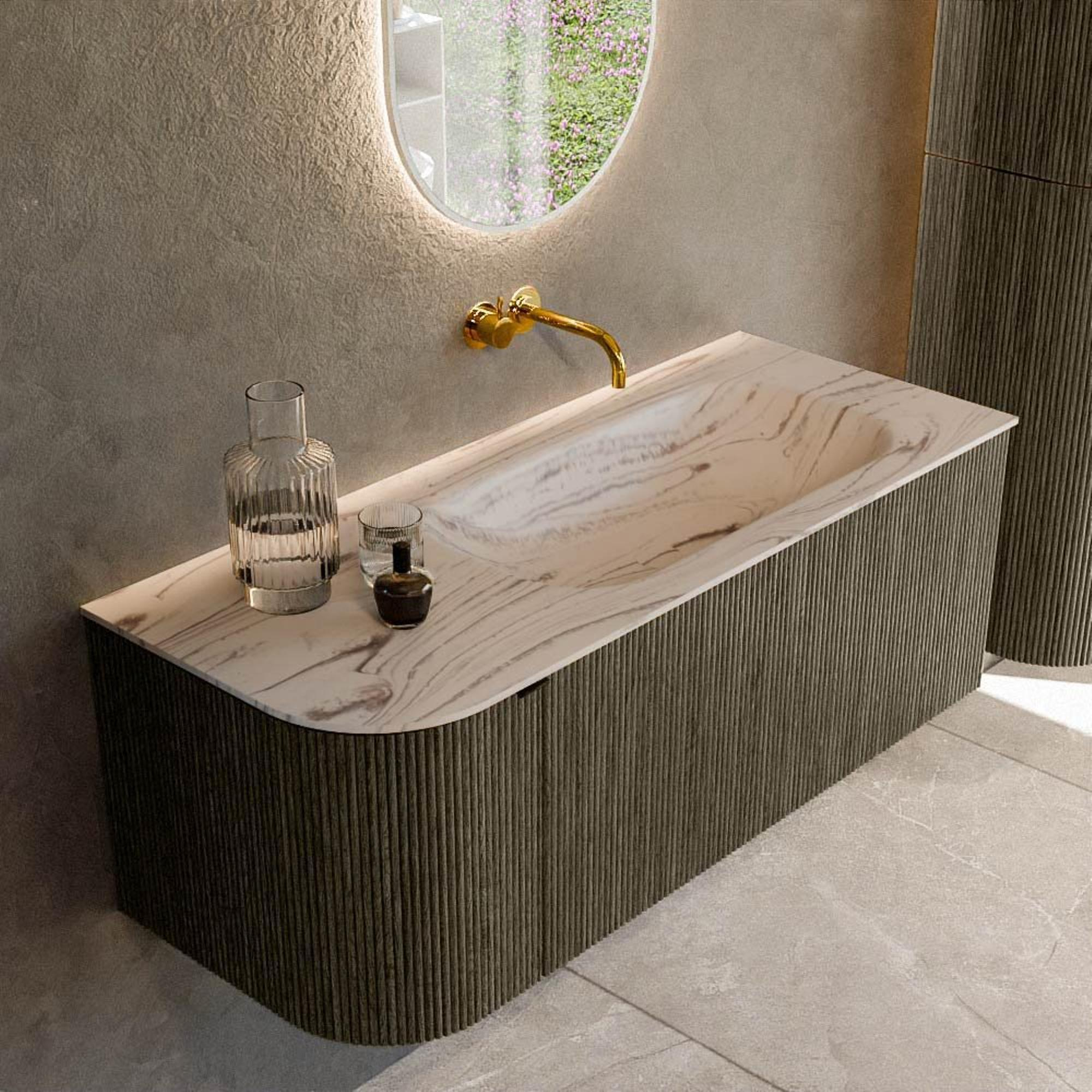 Avec ce meuble élégant, vous créez en une seule fois une atmosphère calme et luxueuse dans votre salle de bains. Grâce à sa largeur généreuse, il est idéal pour une salle de bains familiale ou une grande salle de bains design, tandis que l'aménagement astucieux avec tiroir et porte est également parfait si vous souhaitez beaucoup d'espace de rangement de manière compacte. La forme arrondie d’un côté apporte une touche douce et accueillante, qui s’intègre parfaitement dans un style moderne, hôtel chic ou scandinave. La vasque sans trou de robinet vous donne la liberté de choisir vous-même un robinet posé assorti, afin d’accorder entièrement l’ensemble à vos goûts. Si vous recherchez un meuble de salle de bains haut de gamme qui combine design, espace de rangement pratique et répartition bien pensée, alors c’est un choix particulièrement judicieux.