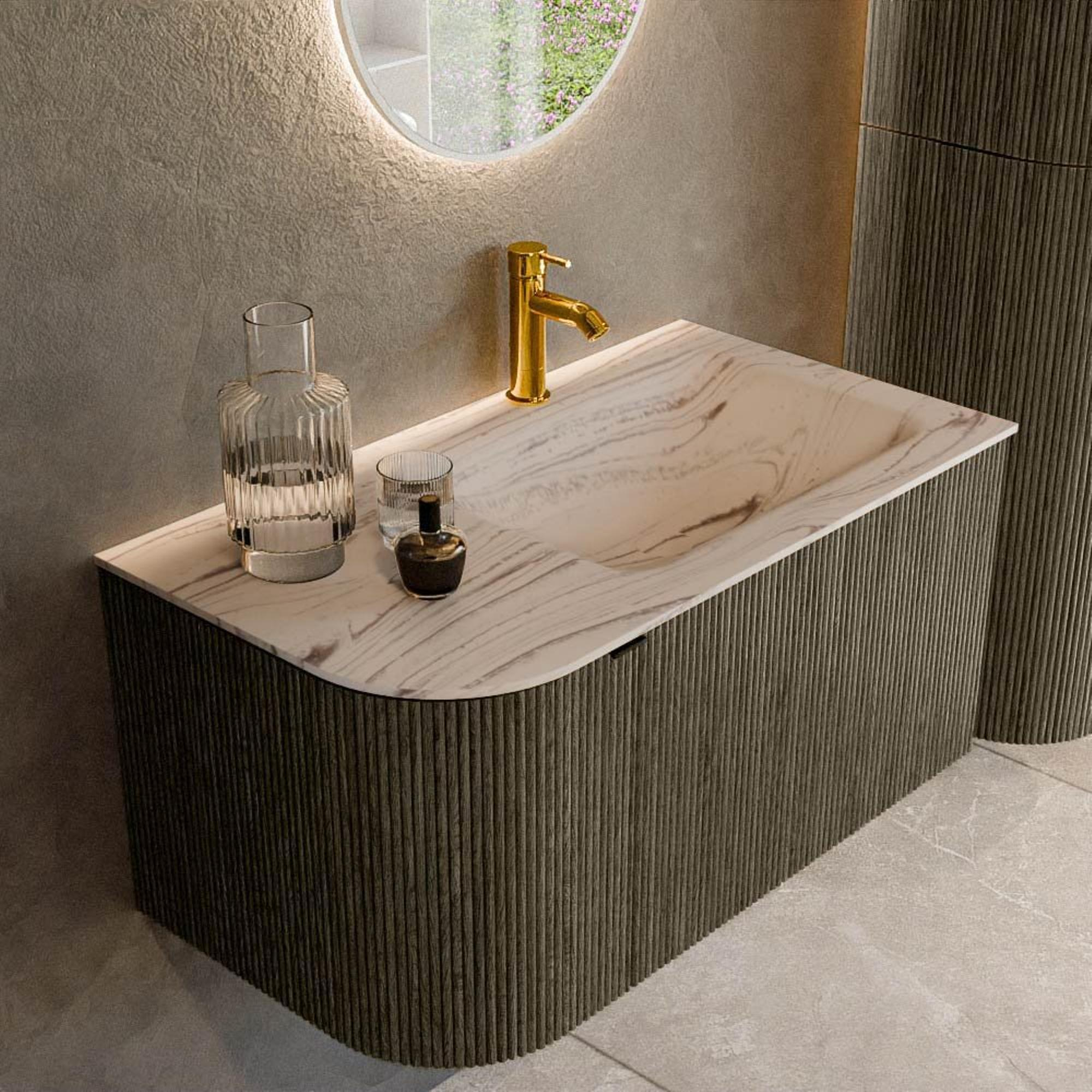 MONDIAZ KURVE-DLUX Meuble de salle de bains 85cm arrondi à gauche couleur Shadow avec 1 tiroir et 1 porte. Lavabo CLOUD à droite 1 trou de robinet Nata.