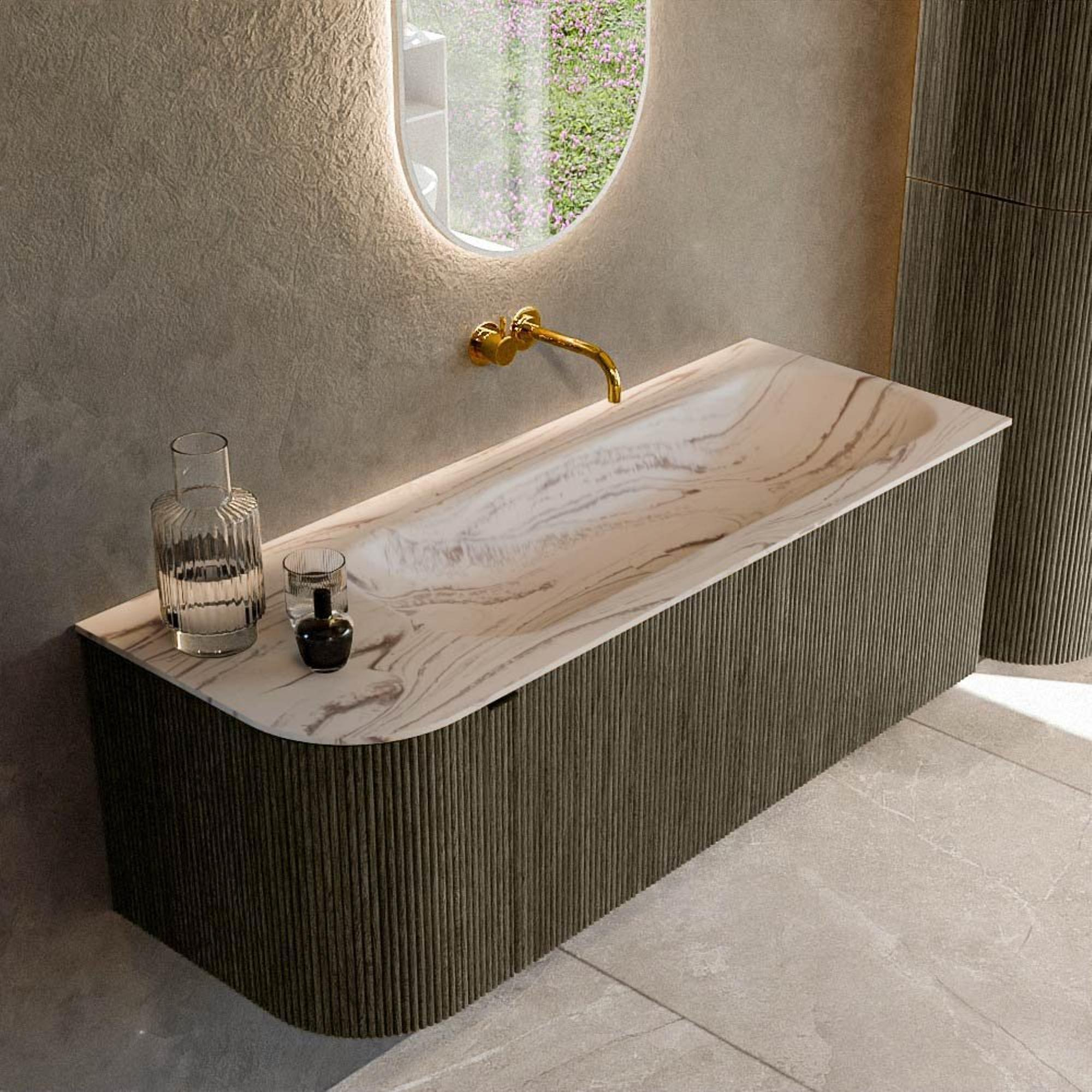 Le galbe caractéristique à gauche apporte non seulement une apparence douce et luxueuse, mais se révèle également pratique dans les salles de bains plus petites ou très fréquentées. L'angle arrondi évite les chocs violents lors des entrées et sorties et rend le meuble agréable à utiliser, en particulier lorsque les enfants se trouvent régulièrement dans la salle de bains. Avec une largeur de 125 cm et une profondeur de 46 cm, le meuble offre un large plan de lavabo, sans empiéter excessivement sur l'espace. Le lavabo est positionné à droite, ce qui vous permet de conserver à gauche une belle ligne élégante le long du mur et d'exploiter au mieux l'espace de circulation. Cette version est donc particulièrement adaptée aux salles de bains où la porte ou la douche se trouve du côté gauche et où vous souhaitez créer juste un peu plus de liberté de mouvement.