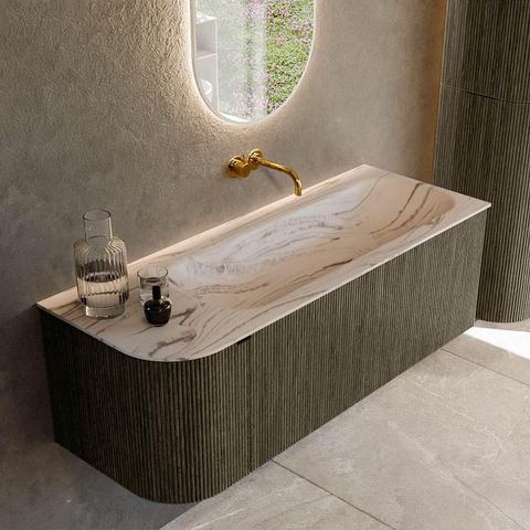 Avec ce meuble de salle de bains spacieux, vous ajoutez à votre intérieur un élément à la fois élégant et pratique, idéal pour une salle de bains familiale moderne ou une grande salle de bains design dans laquelle vous recherchez une forme douce et organique plutôt que des lignes strictes. Grâce au côté arrondi, l'ensemble apparaît accueillant et léger, tandis que la grande dimension de 125 cm offre suffisamment d'espace de rangement et de surface de pose pour un usage quotidien. La combinaison d'une couleur de meuble sombre et chaleureuse avec un lavabo en solid surface clair s'harmonise parfaitement avec des styles de salle de bains populaires tels que hôtel chic, moderne industriel ou scandinave. Si vous recherchez un meuble qui respire le design tout en étant confortable à utiliser, par exemple parce que vous utilisez la salle de bains à plusieurs en même temps ou que vous aimez avoir un plan de lavabo bien dégagé, cet ensemble est alors un choix particulièrement judicieux.